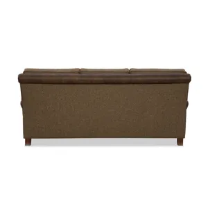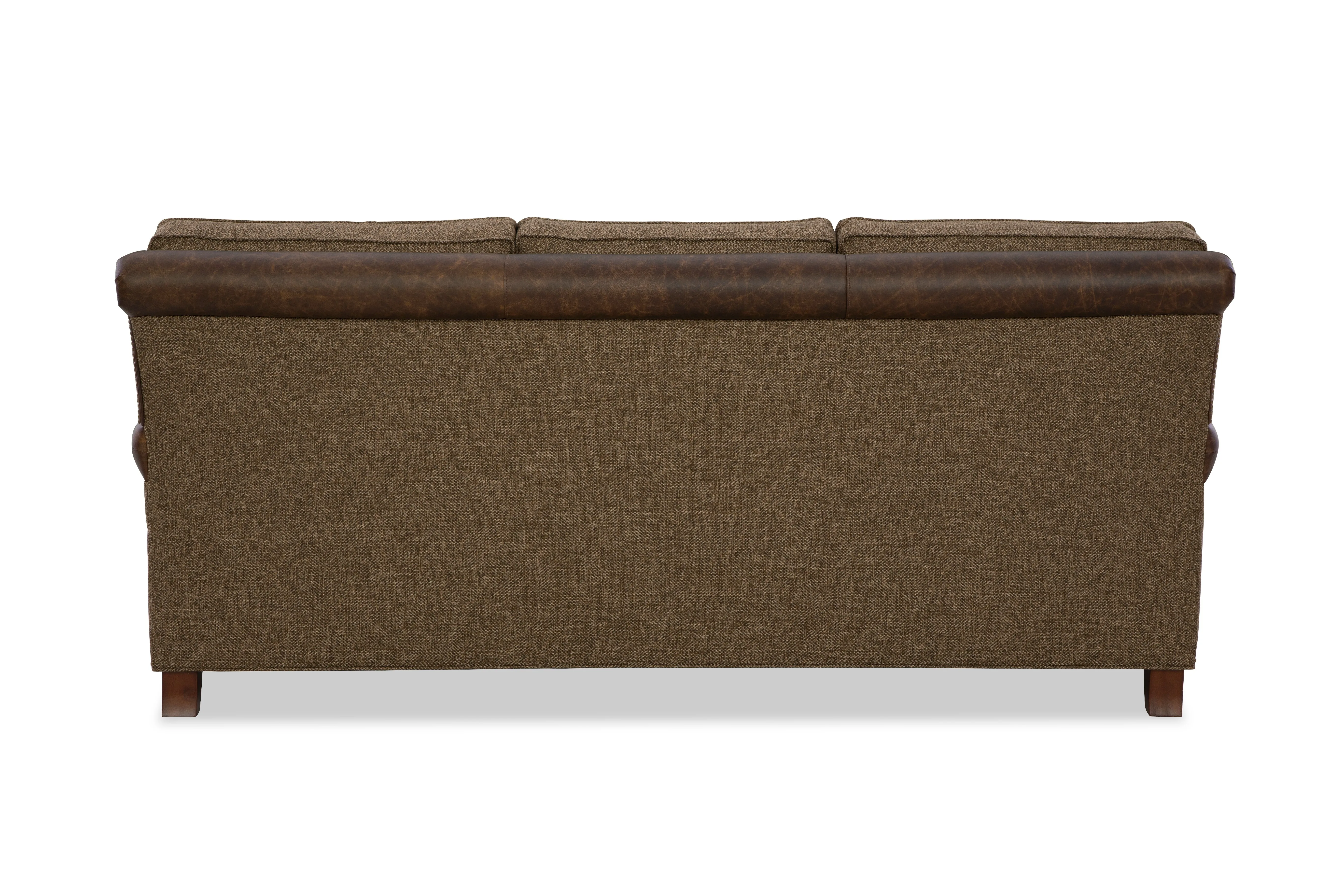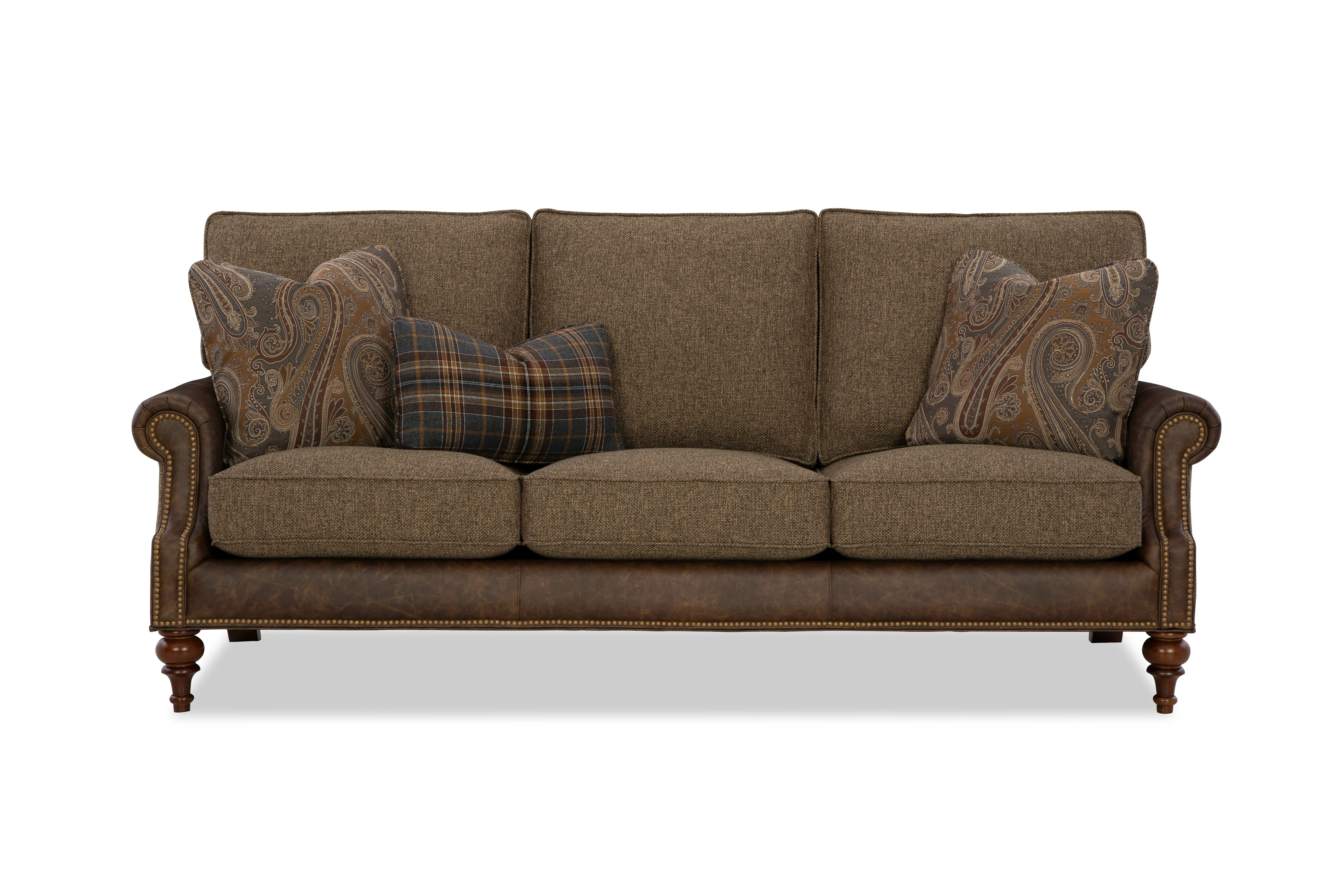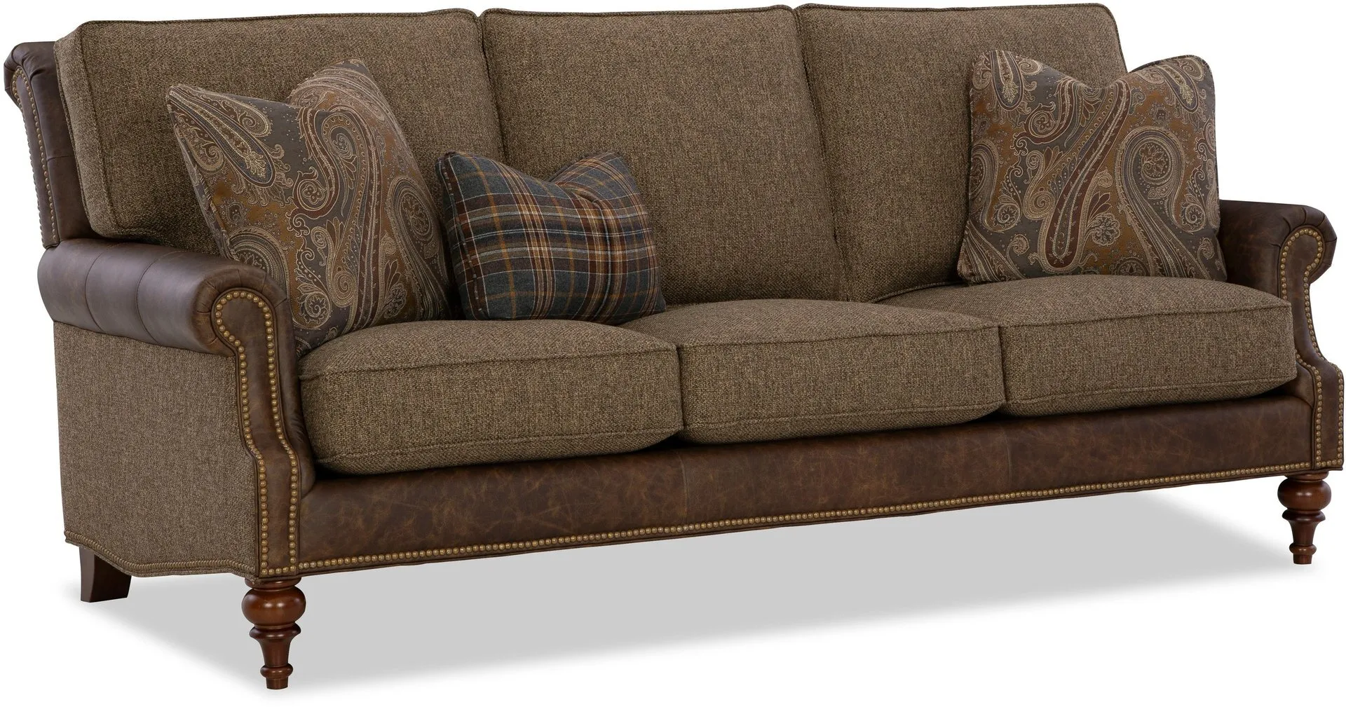 Classic traditional details and nail head trim accents are some of the things you'll love on this gracefully finessed sofa. Covered in both leather and fabric, it has a unique blended look that can be fully customized with any fabric and leather in our line. It features a rollover back, cut-back rolled arms, and beautifully turned legs that offer a familiar heirloom touch.