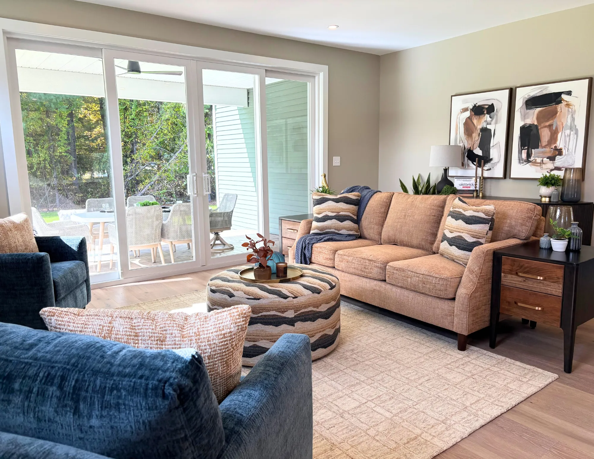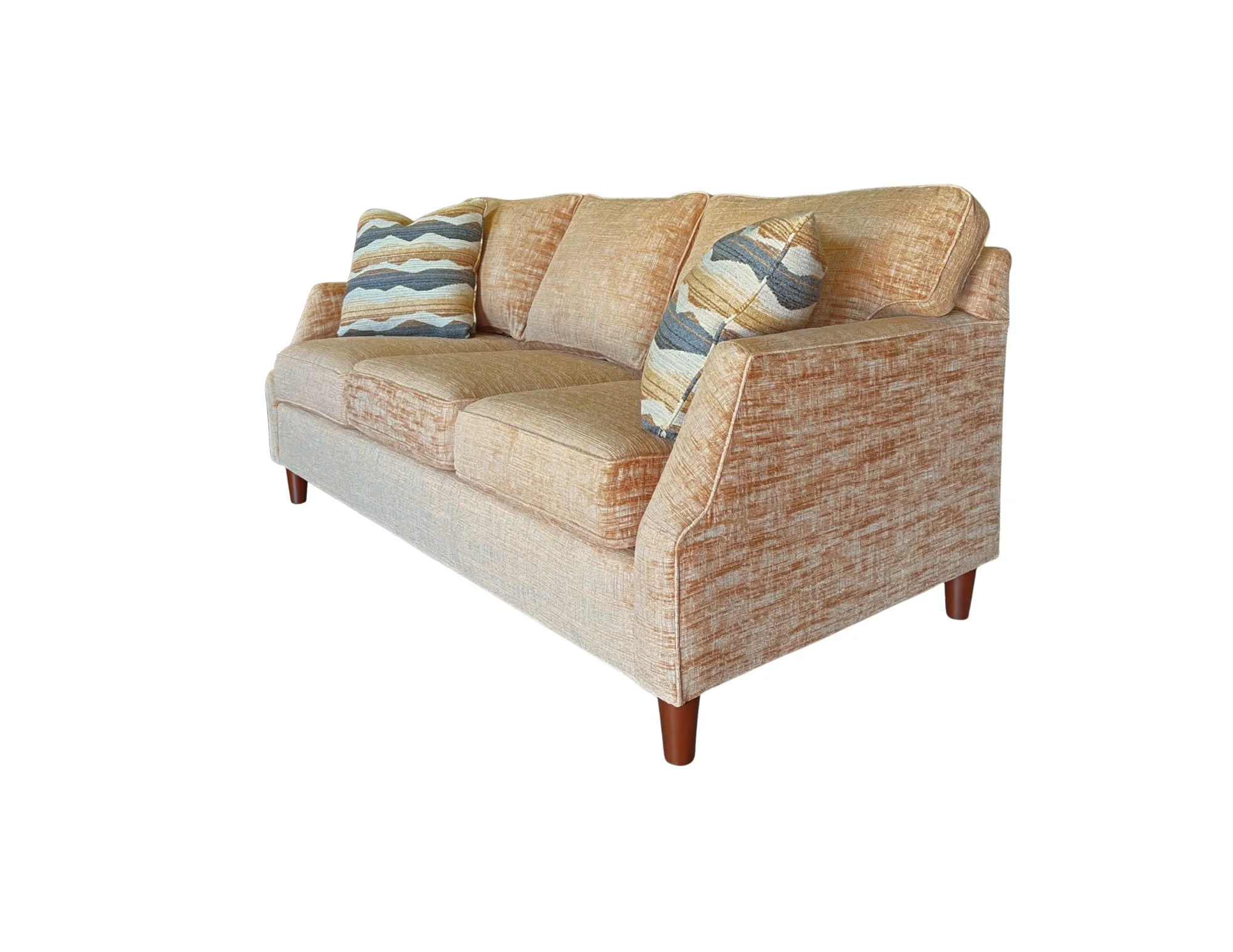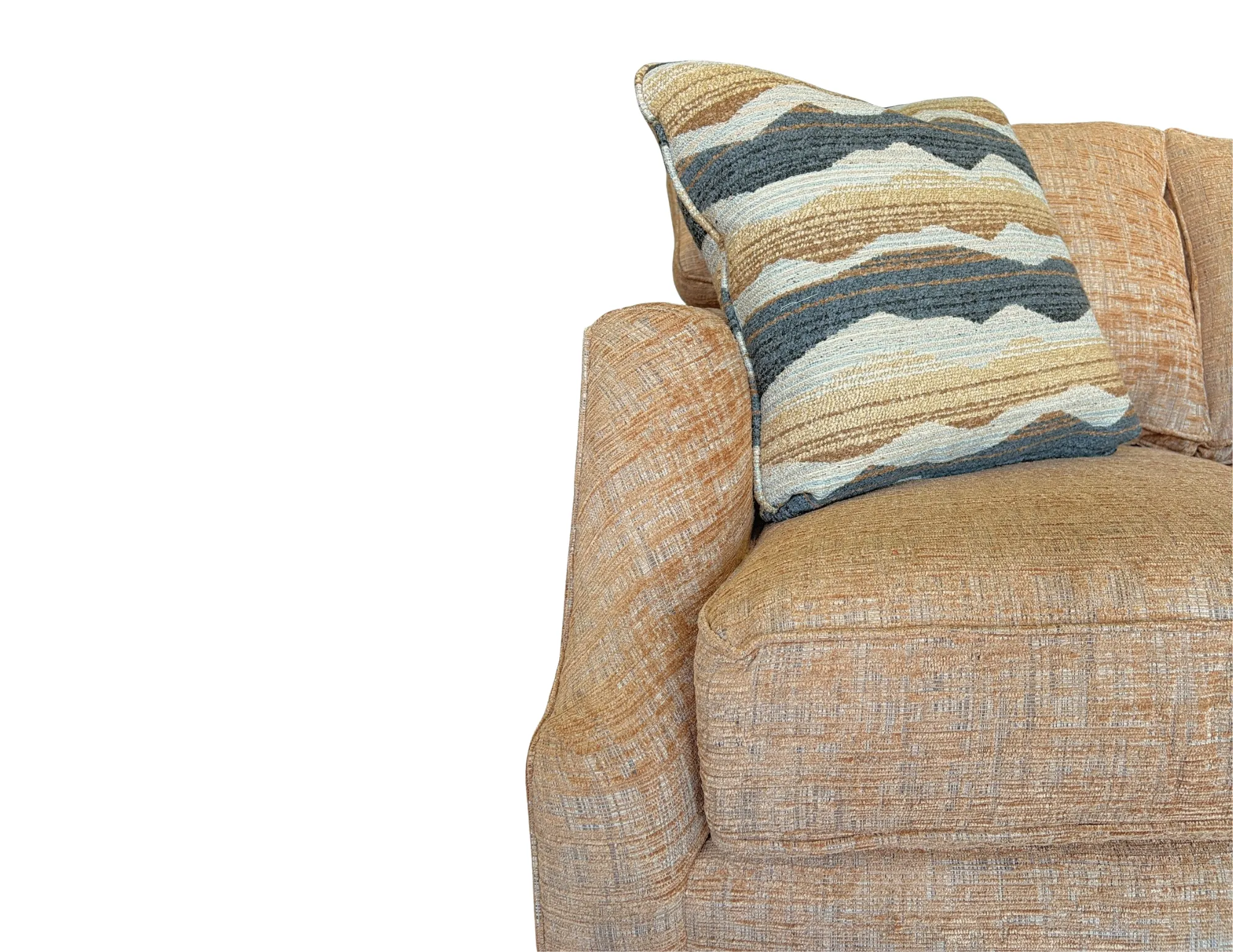 • Upholstered in Corolla 07 woven fabric with warm orange, off-white, and beige tones
