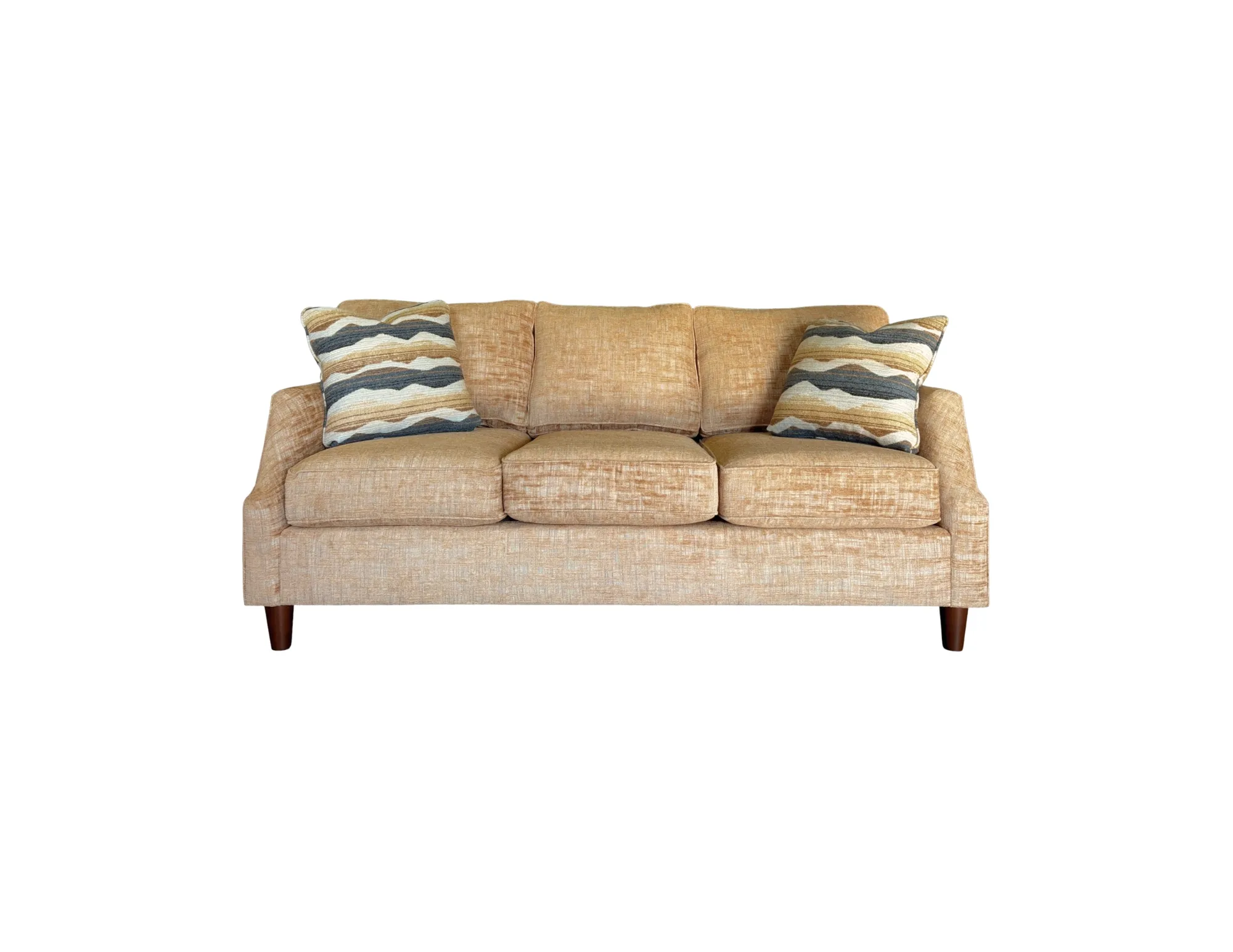 The Craftmaster M944 Sofa in Corolla 07 fabric with Trails End 07 pillows offers transitional style and cozy woven texture. Perfect as a warm-toned fabric sofa for living rooms or family spaces, it pairs comfort and design beautifully while coordinating with other pieces from the M944 Collection. For custom options, please inquire for more details!Â