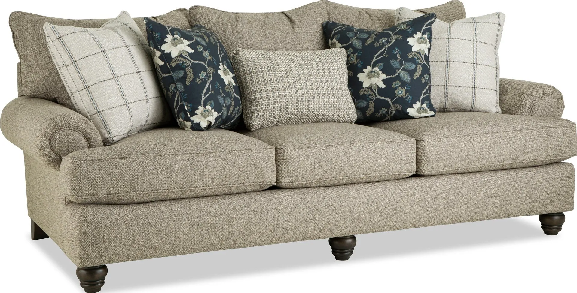 The Craftmaster Three Cushion Sofa in Varano 07 fabric is one of our all-time best sellers, blending generous scale, timeless style, and unbeatable comfort. At 100″ in length, it offers plenty of room for the whole family, while deep, plush seating and premium cushions create the perfect spot for everyday lounging. Set-back paneled roll arms and turned legs add a classic touch, while a mix of five coordinating accent pillows completes the look with layered style.
