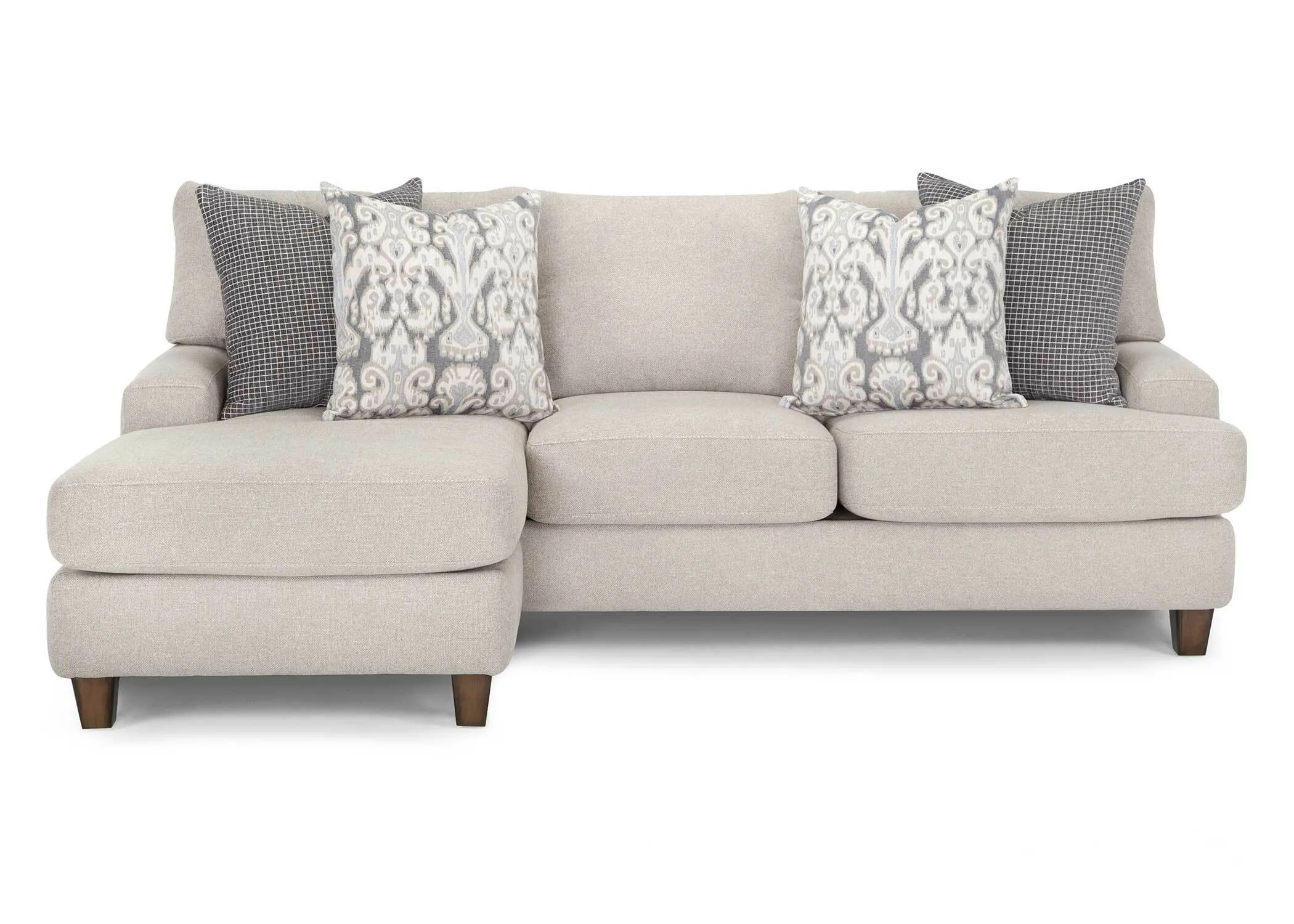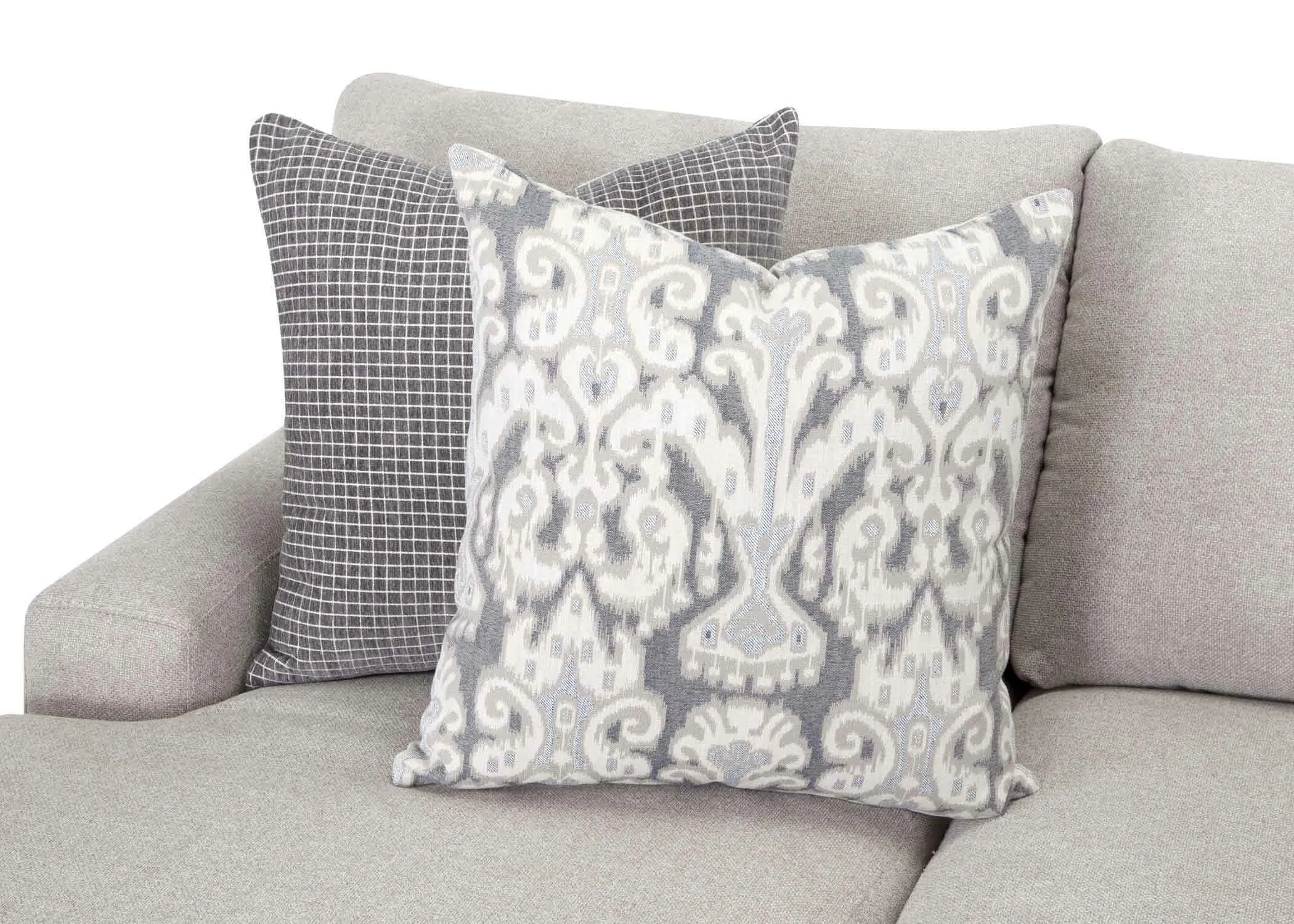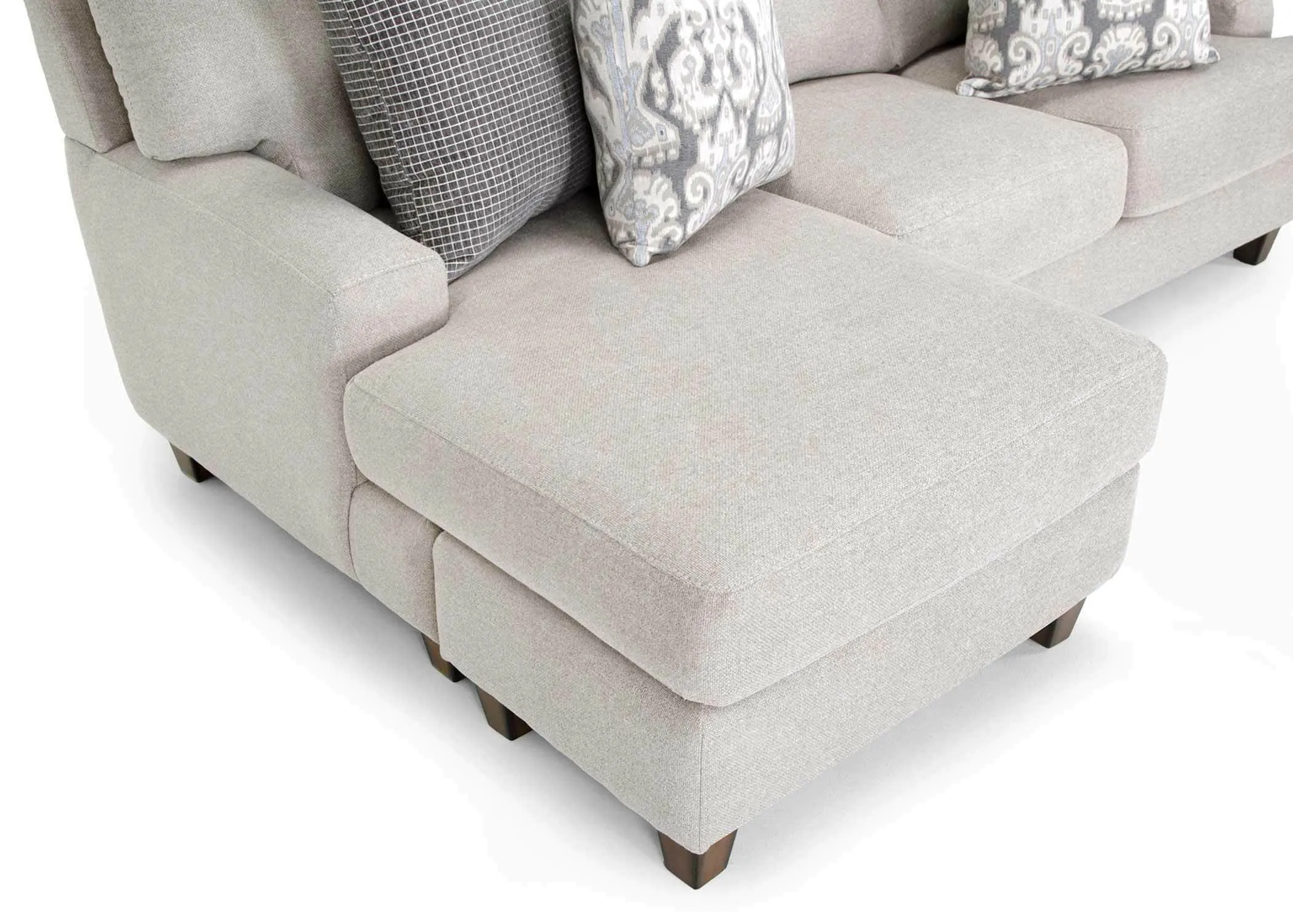 The 960 Cleo collection offers a sofa with reversible chaise, chair and a half and matching ottoman upholstered in a soft light gray fabric, and accenting throw pillows with pops of light and dark gray. Meticulously crafted, the Cleo provides unsurpassed comfort without sacrificing style.