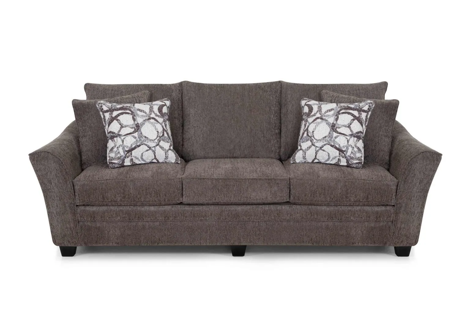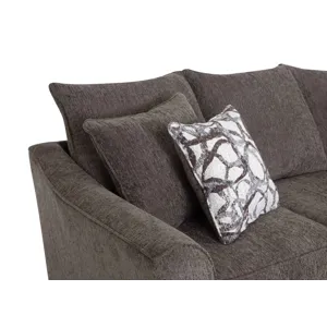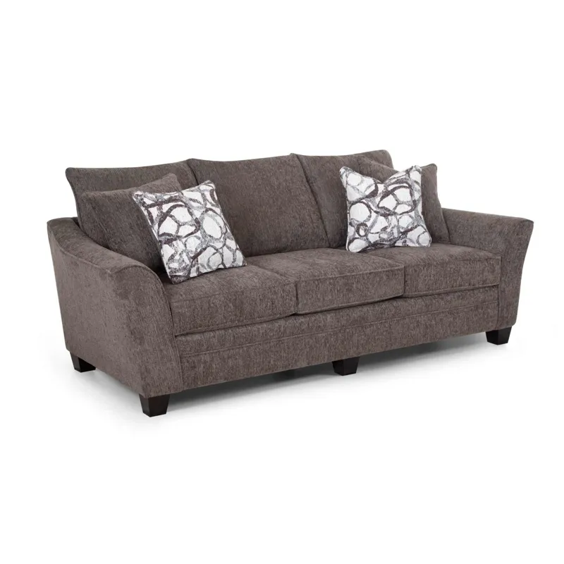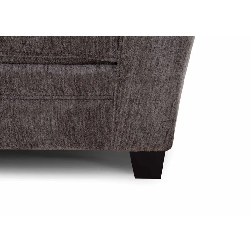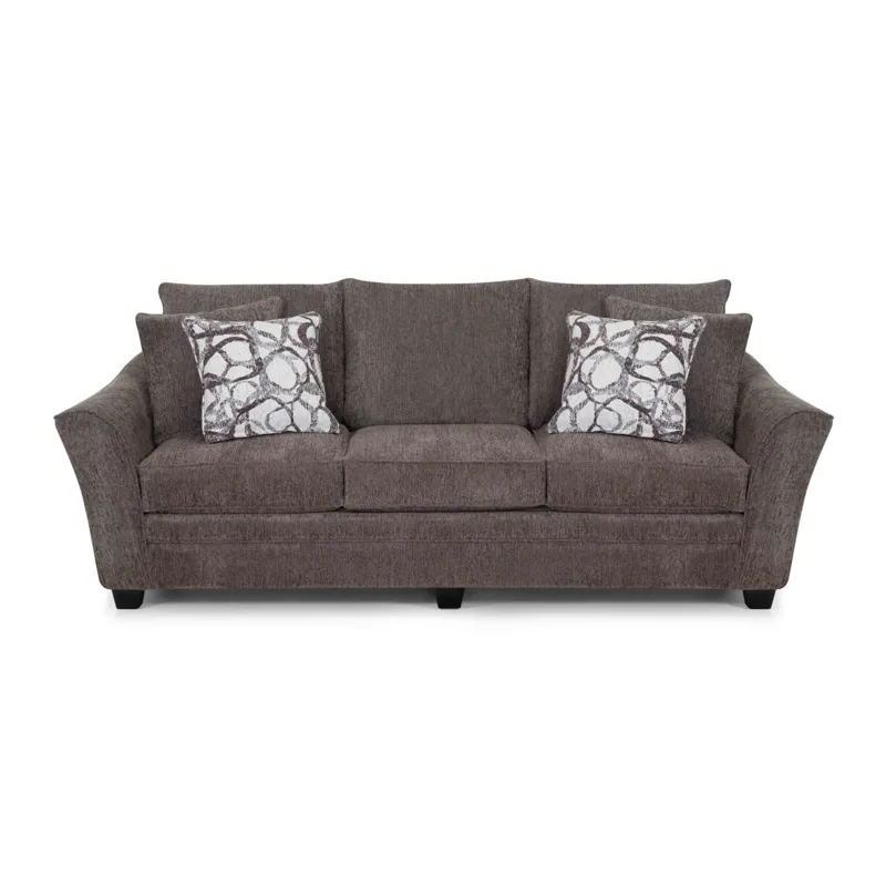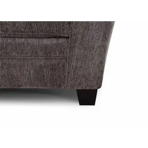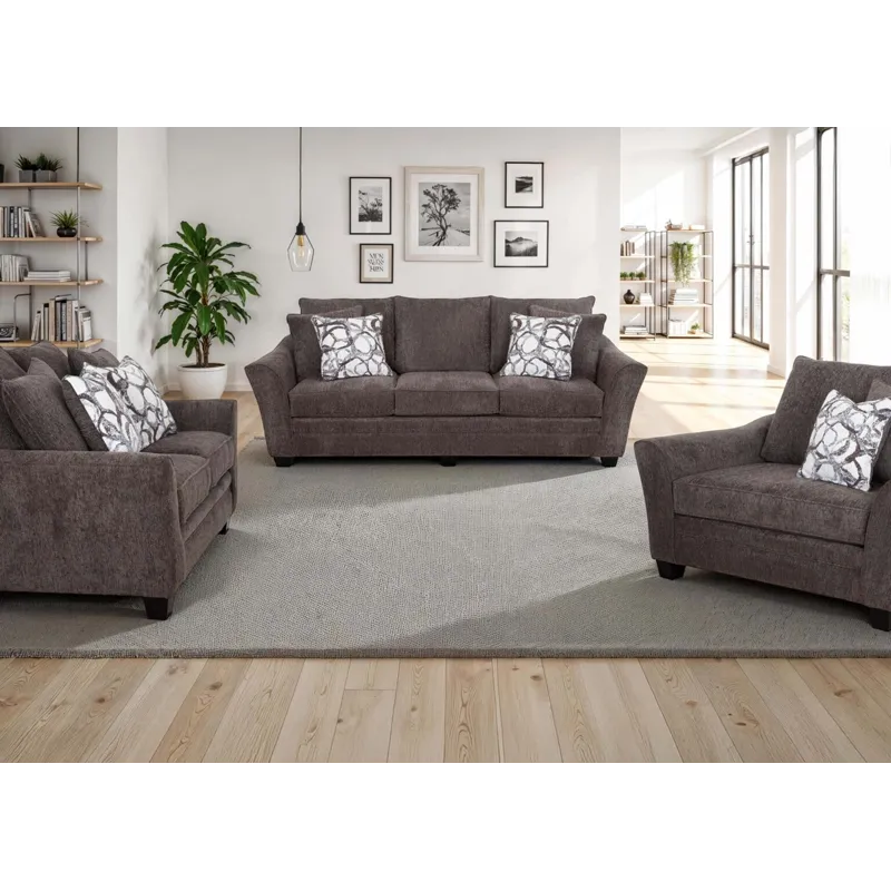 Experience a touch of “flare” with the meticulously crafted 910 Tiffani Collection. This thoughtfully designed collection includes a sofa, loveseat, chair and half and matching ottoman. All pieces are upholstered in a soft, durable gray fabric that is contrasted with coordinating accent pillows. Flared arms add a contemporary element, while solid wooden legs provide increased durability.