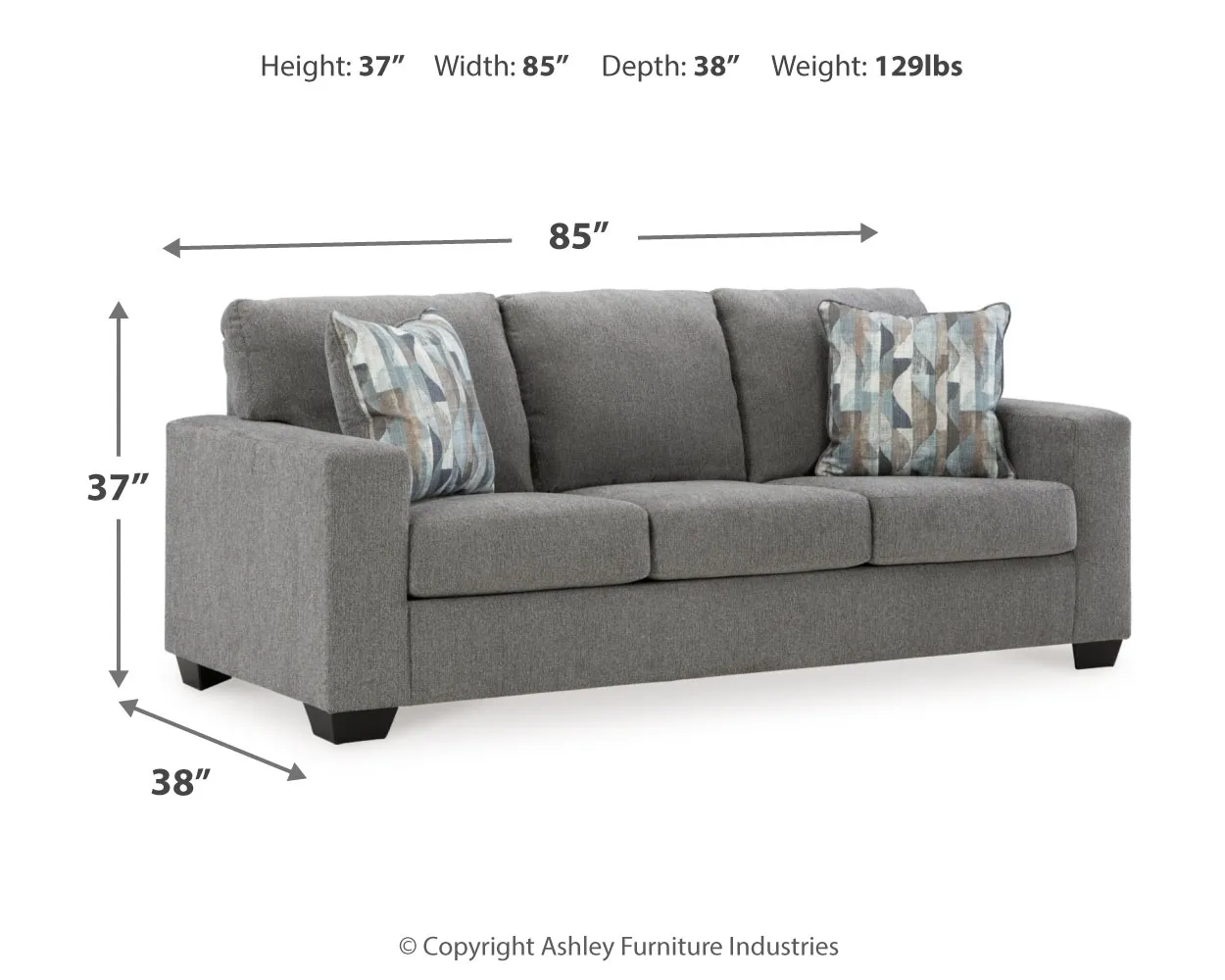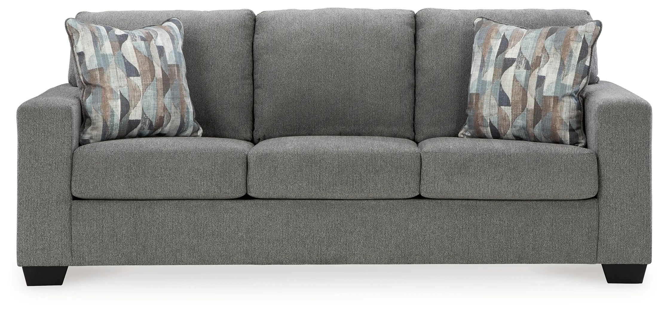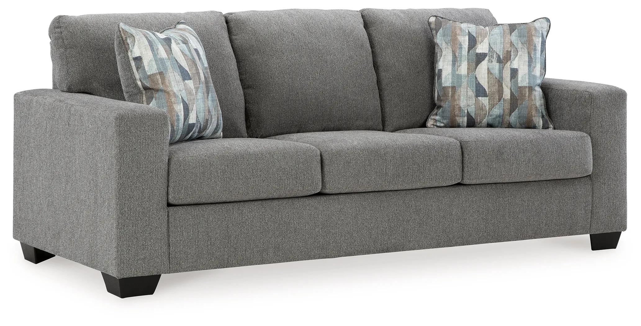 You’re in for a neat treat with this sofa. Its comfy seats are covered in soft, textural upholstery, and the wide track arms are eager to support your quest for total relaxation. Distressed abstract toss pillows bring a fresh breath of contemporary style while accentuating the sofa's color.