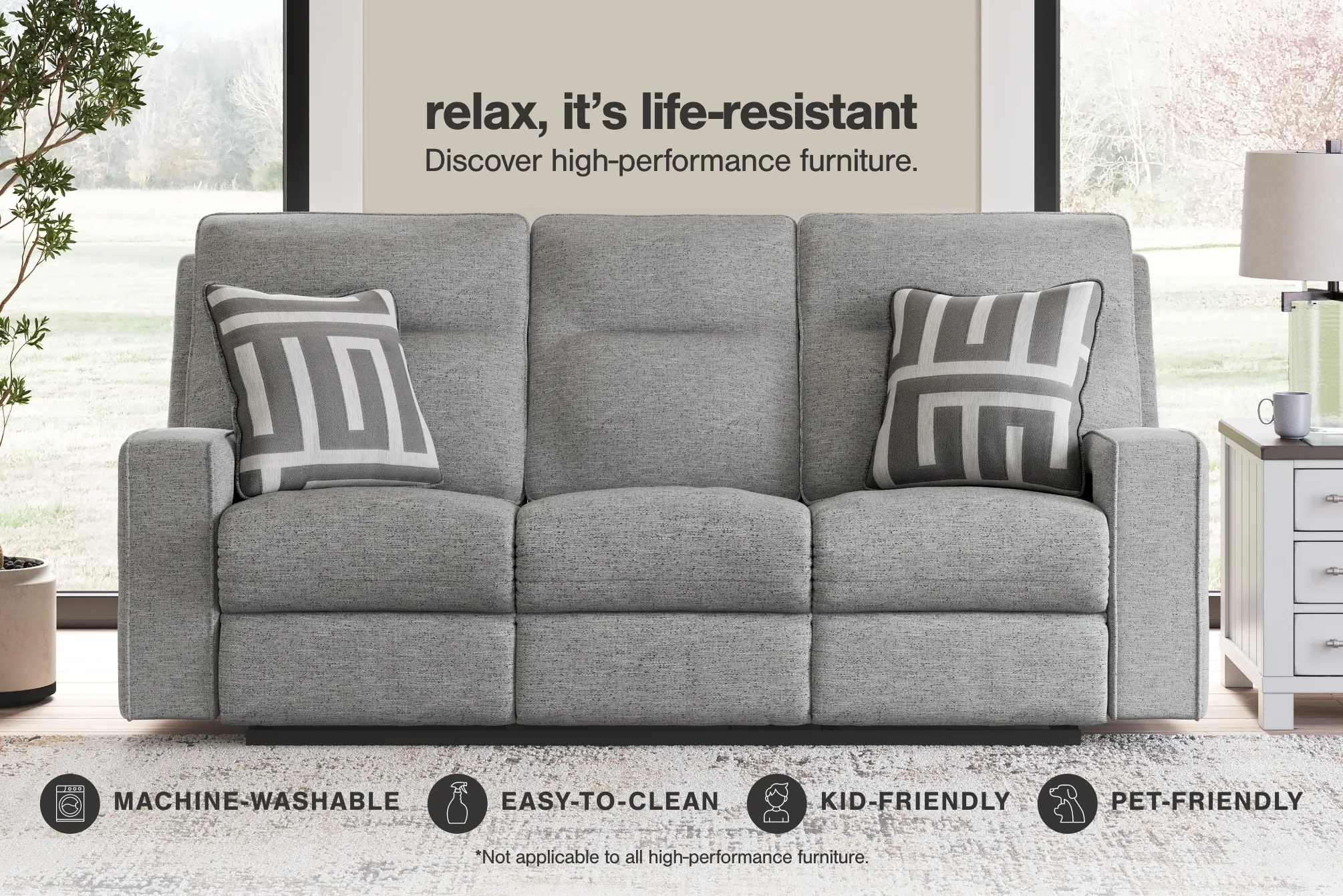 • Performance Upholstery: Wrapped in Next-Gen Nuvella™ solution-dyed fabric—soft, durable, family-friendly, and resistant to stains, fading, and wear.