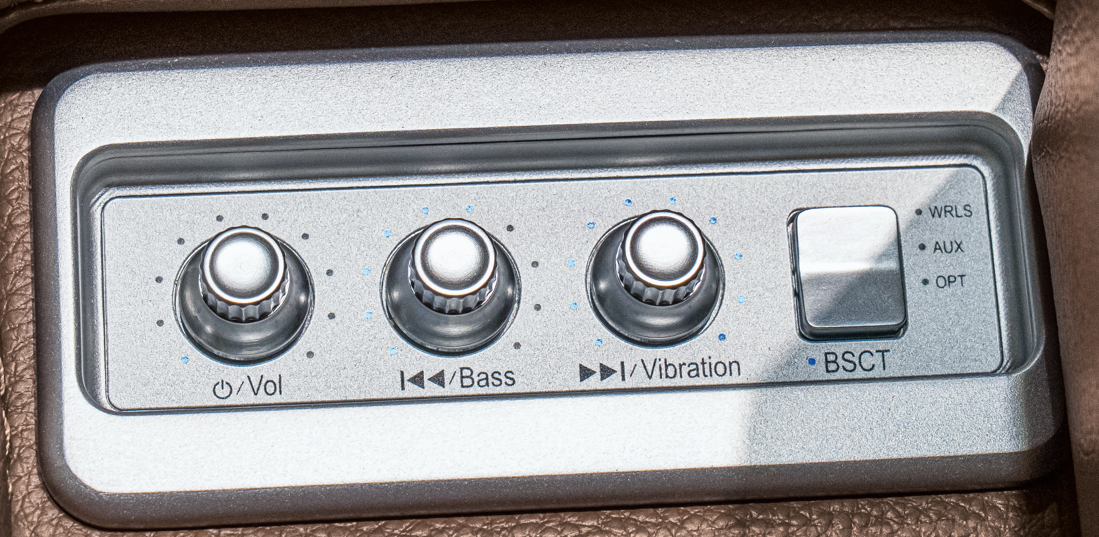• Convenient design – Hidden Thunder control panels in the arms with adjustable bass, volume, and vibration, plus flip-top storage and USB-A/C ports