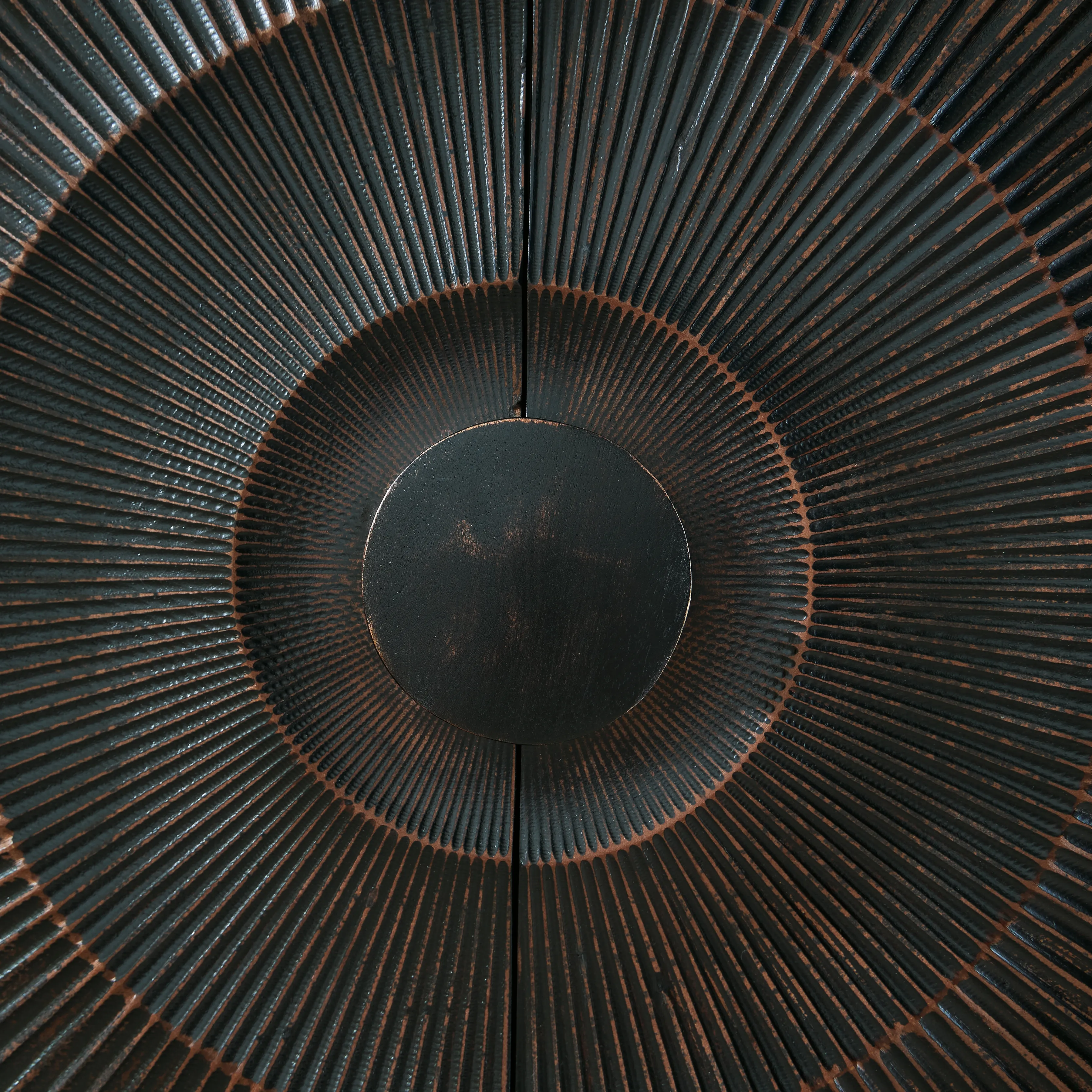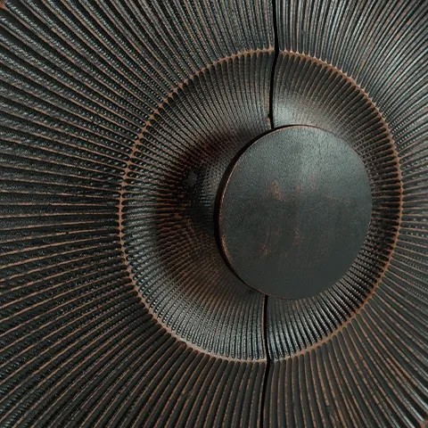 • Carved sunburst door fronts with oversized wood pulls for bold visual impact