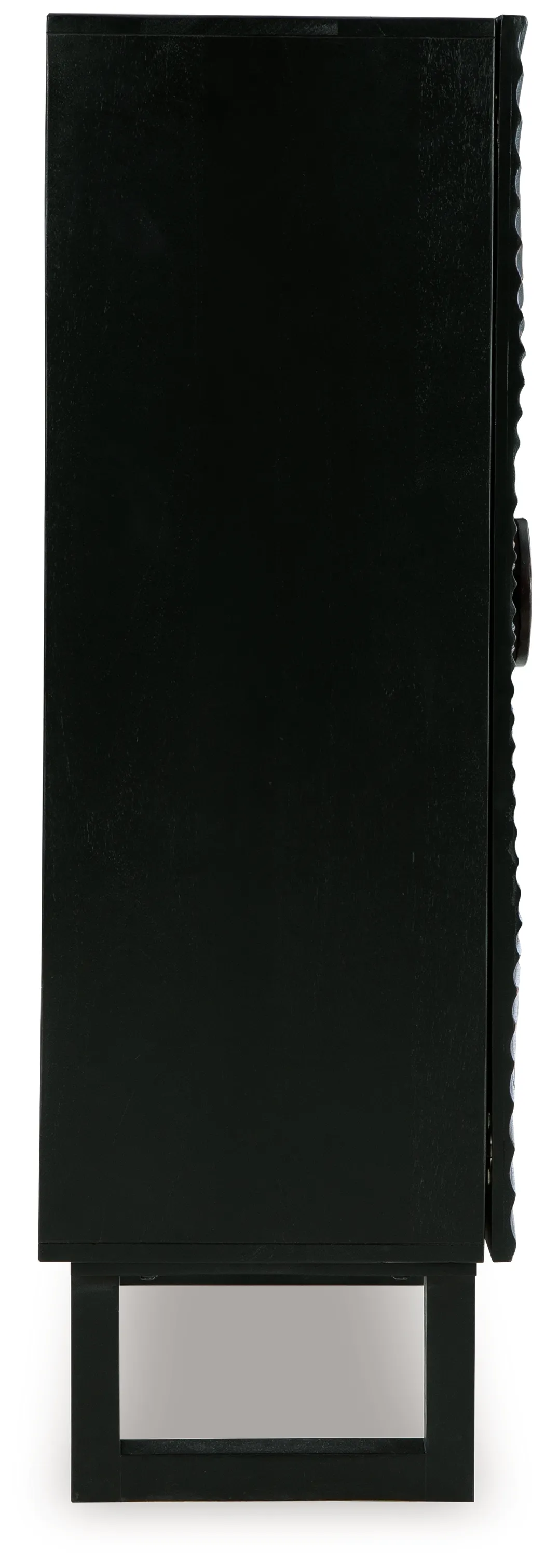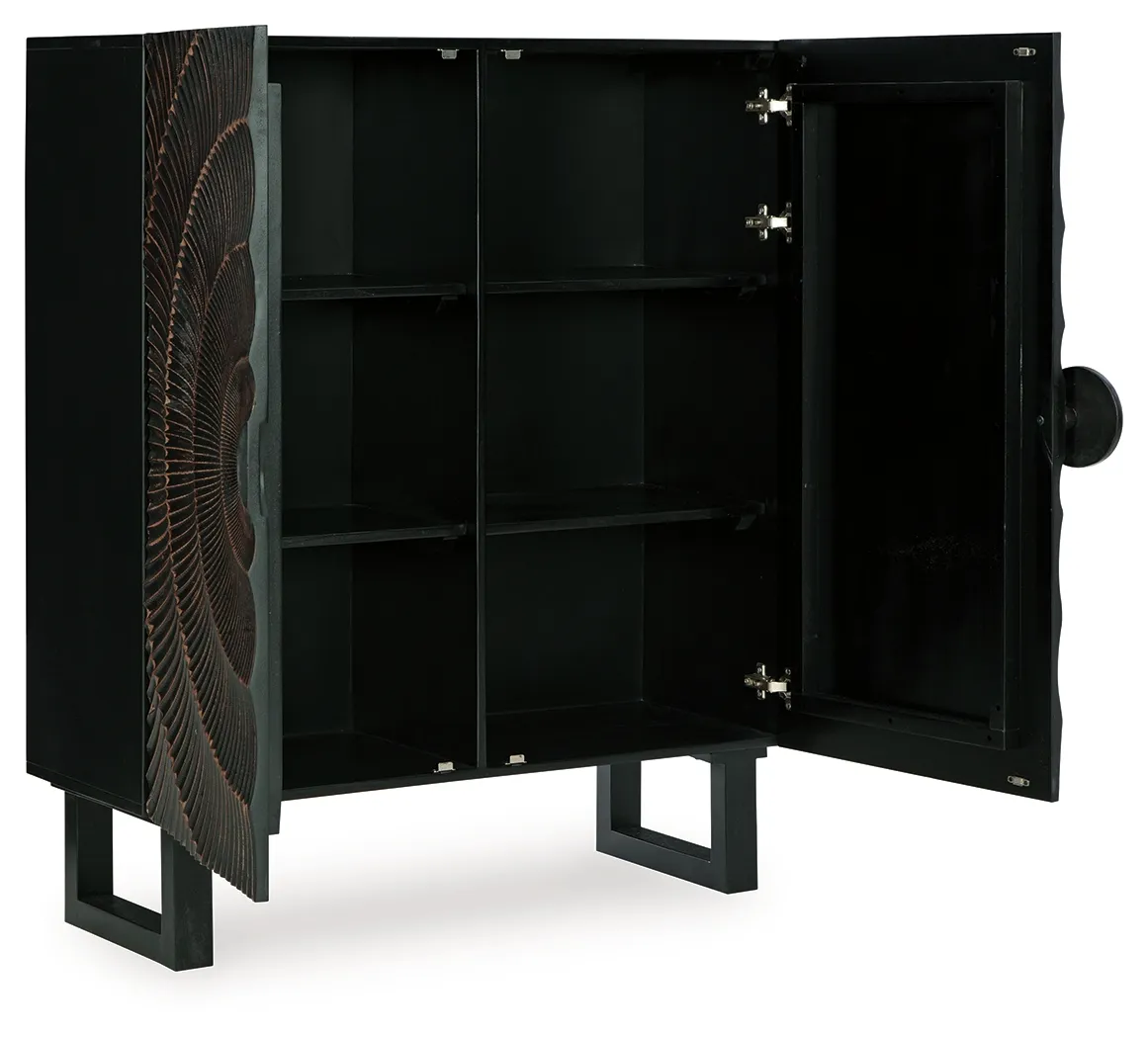 The Fosterman Carved Accent Cabinet brings bold artistic texture and functional storage to any room. Its dramatic sunburst-carved doors and distressed black finish create a striking focal point that blends easily with modern, eclectic, or global-inspired interiors. Thoughtfully scaled for living rooms, dining areas, hallways, or bedrooms, this cabinet offers concealed storage behind its statement doors while maintaining a clean, sculptural presence. Stylish, sturdy, and versatile, it’s a true showpiece that elevates any space.