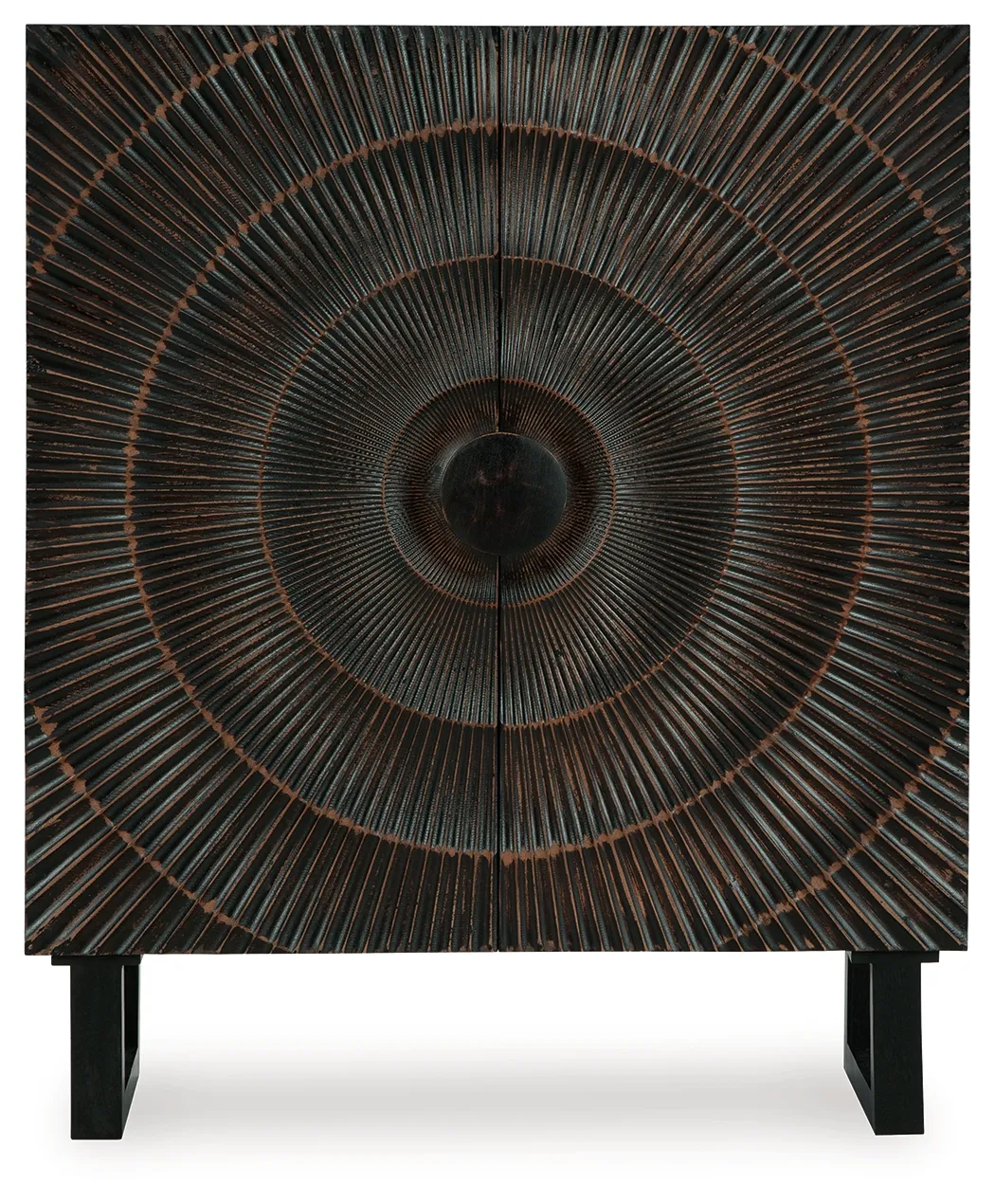The Fosterman Carved Accent Cabinet in distressed black offers modern artistic flair with sunburst-carved doors, sturdy wood construction, and hidden storage. Perfect as a living room cabinet, hallway accent, or dining storage piece, it adds sculptural style and functional organization to any home.