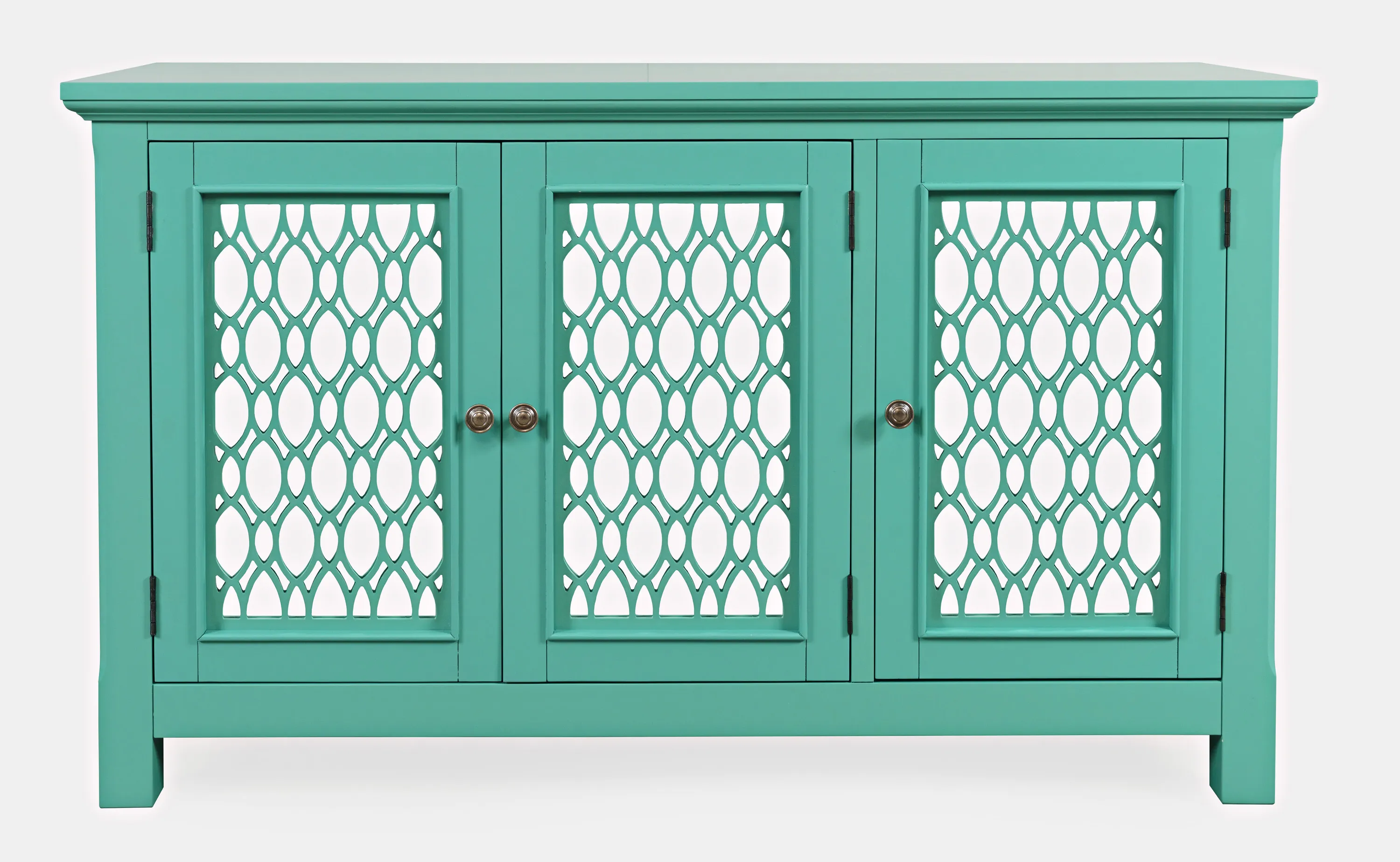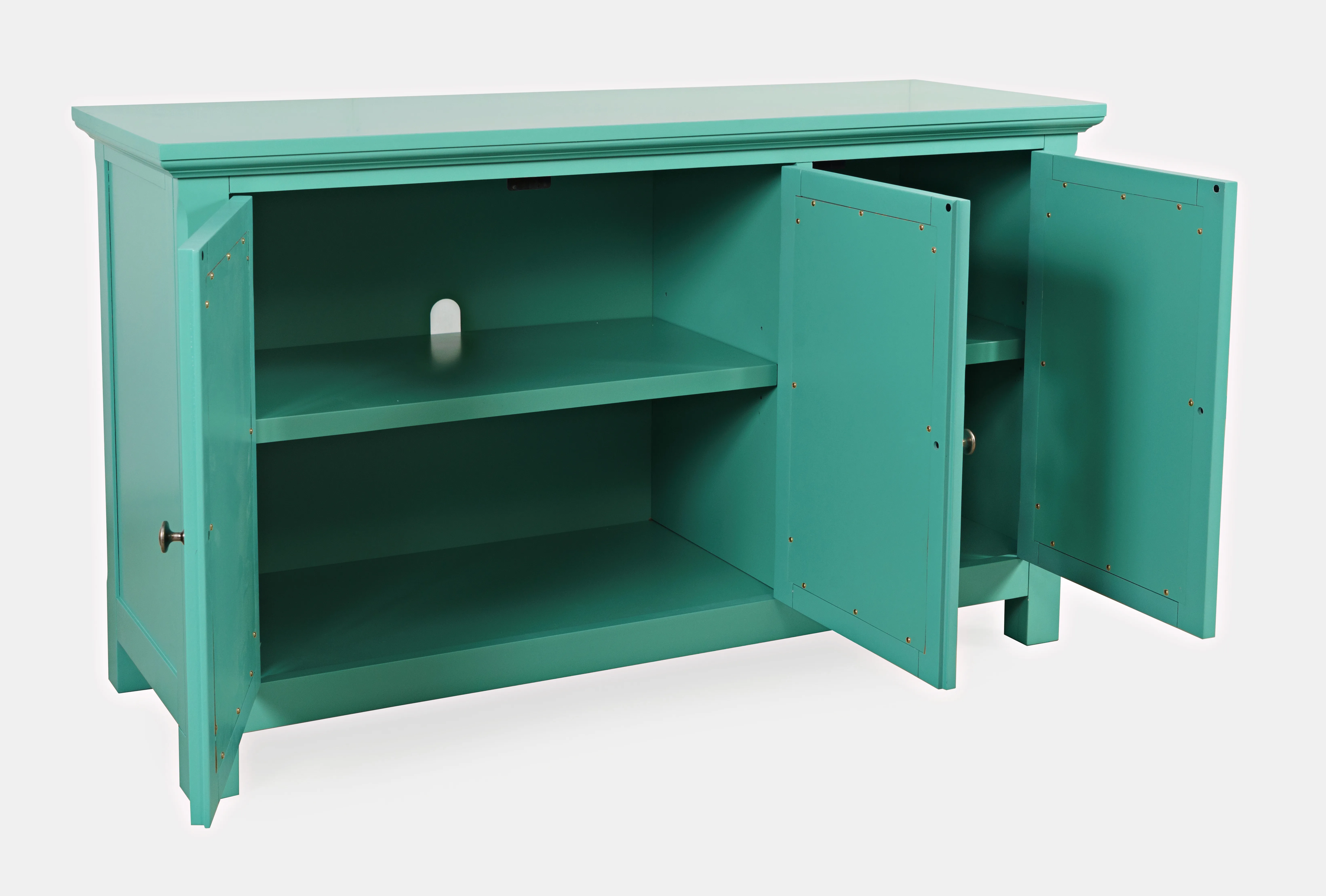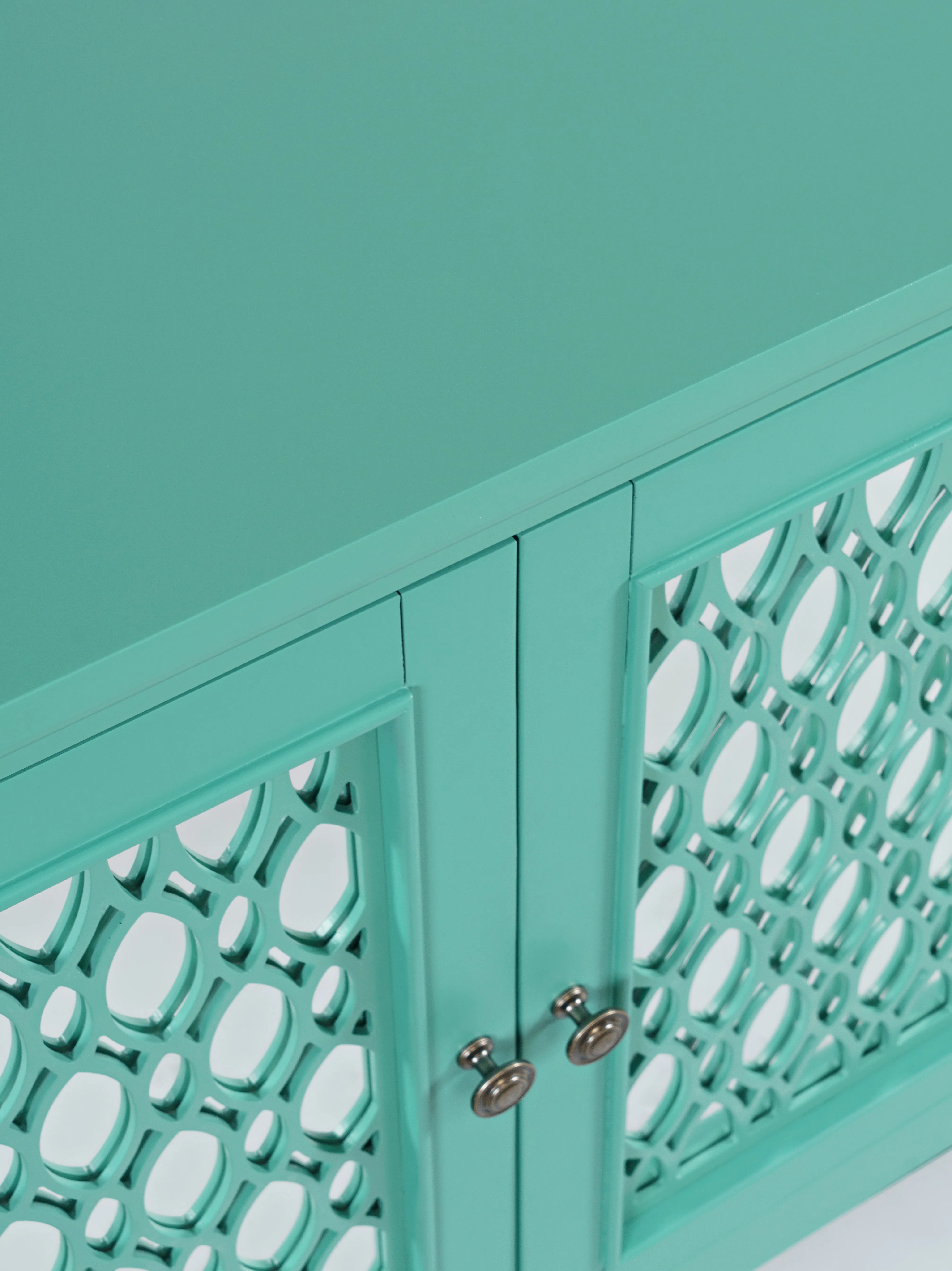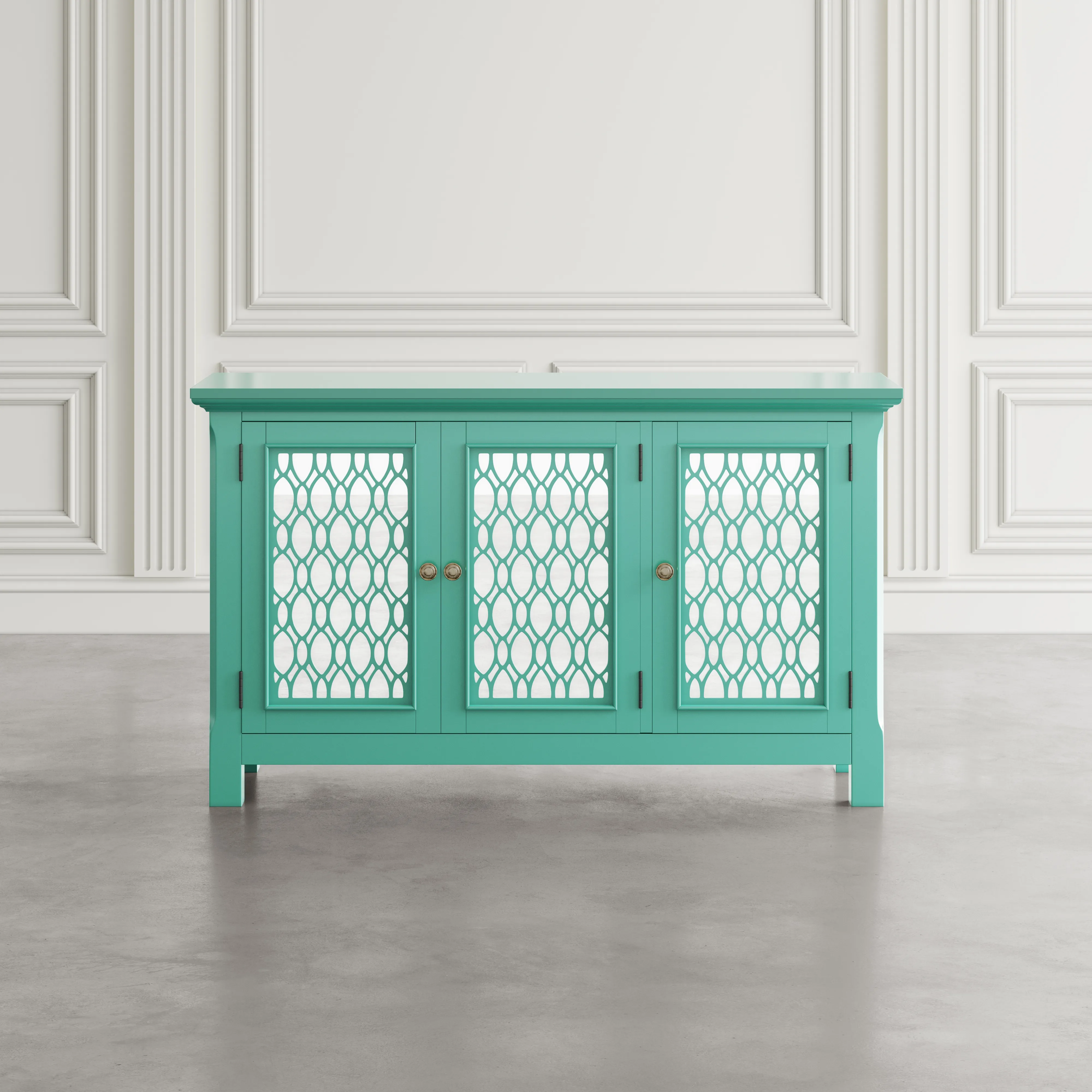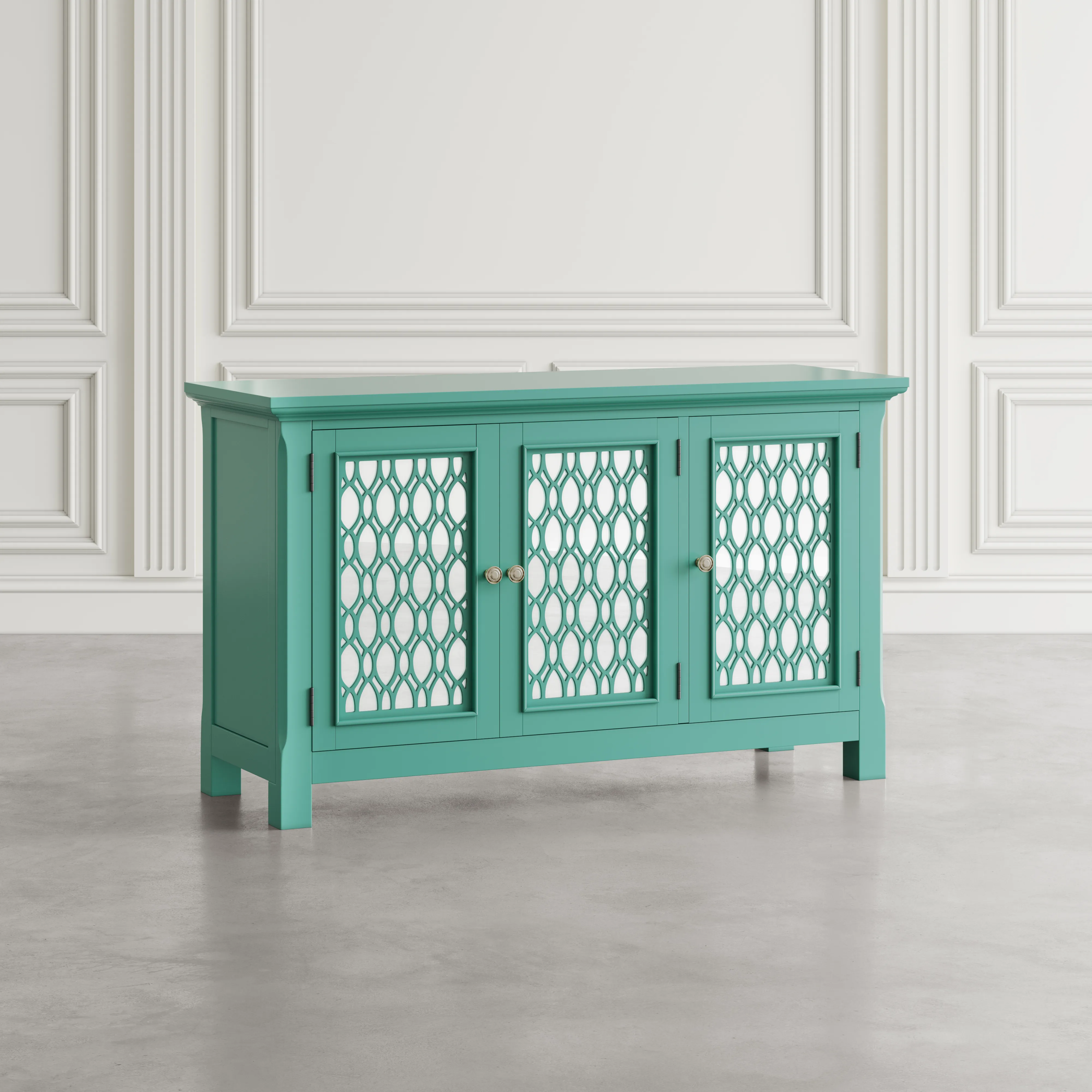 Experience the perfect blend of luxury and functionality with the Isabella mirrored three-door accent cabinet. Measuring 54 inches wide with inlaid fretwork and reflective doors that create a stunning effect that brightens up any room in your home with sophistication. Making a bold statement with a sleek design and solid metal hardware, the interior features adjustable shelving and cable management cutouts that allow you to customize the space to your exact storage needs. Easy to assemble and built with sturdy construction, the Isabella is a showstopper in any room. Make a statement and add a pop of luxury to your living space with the Isabella mirrored three-door accent cabinet.
