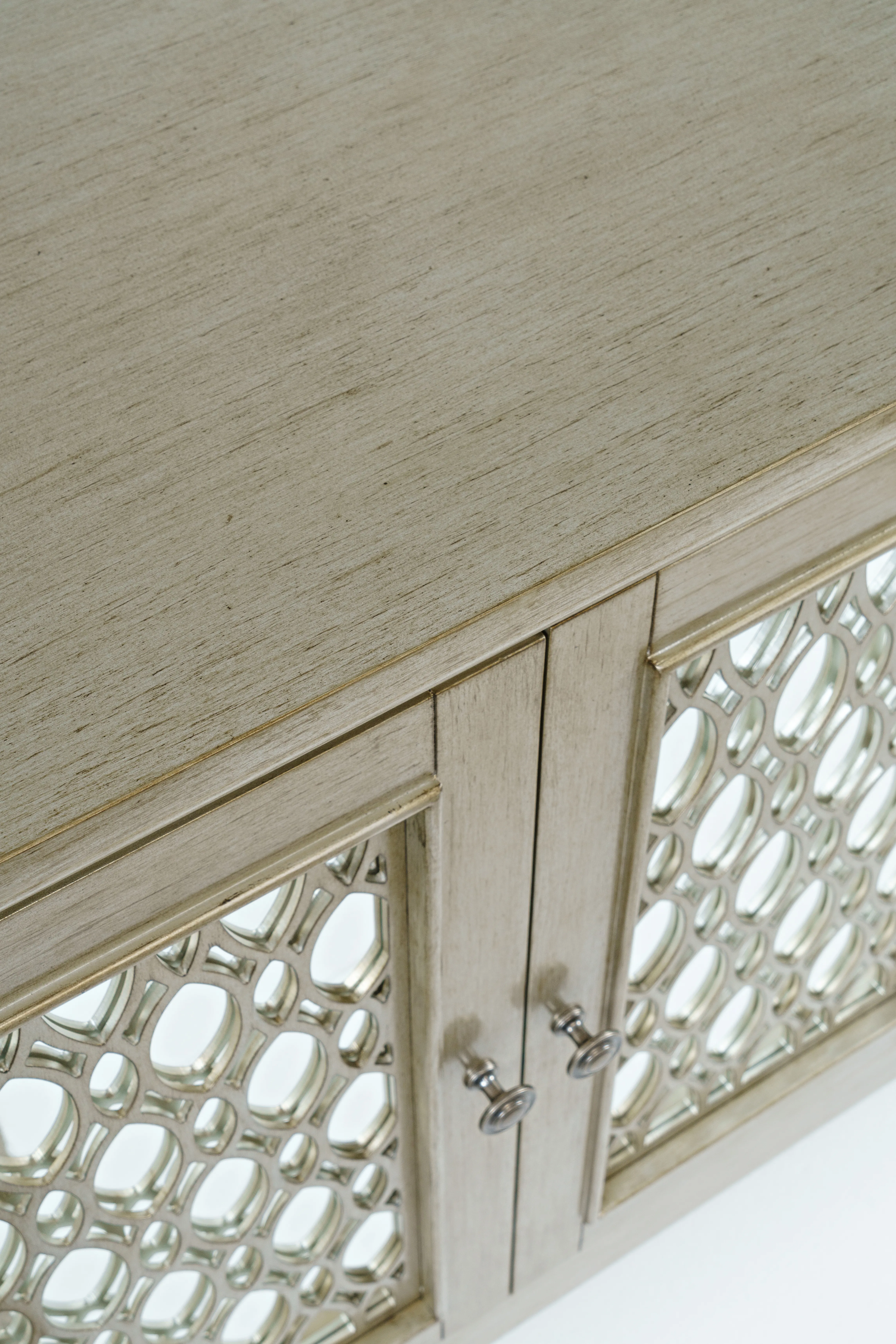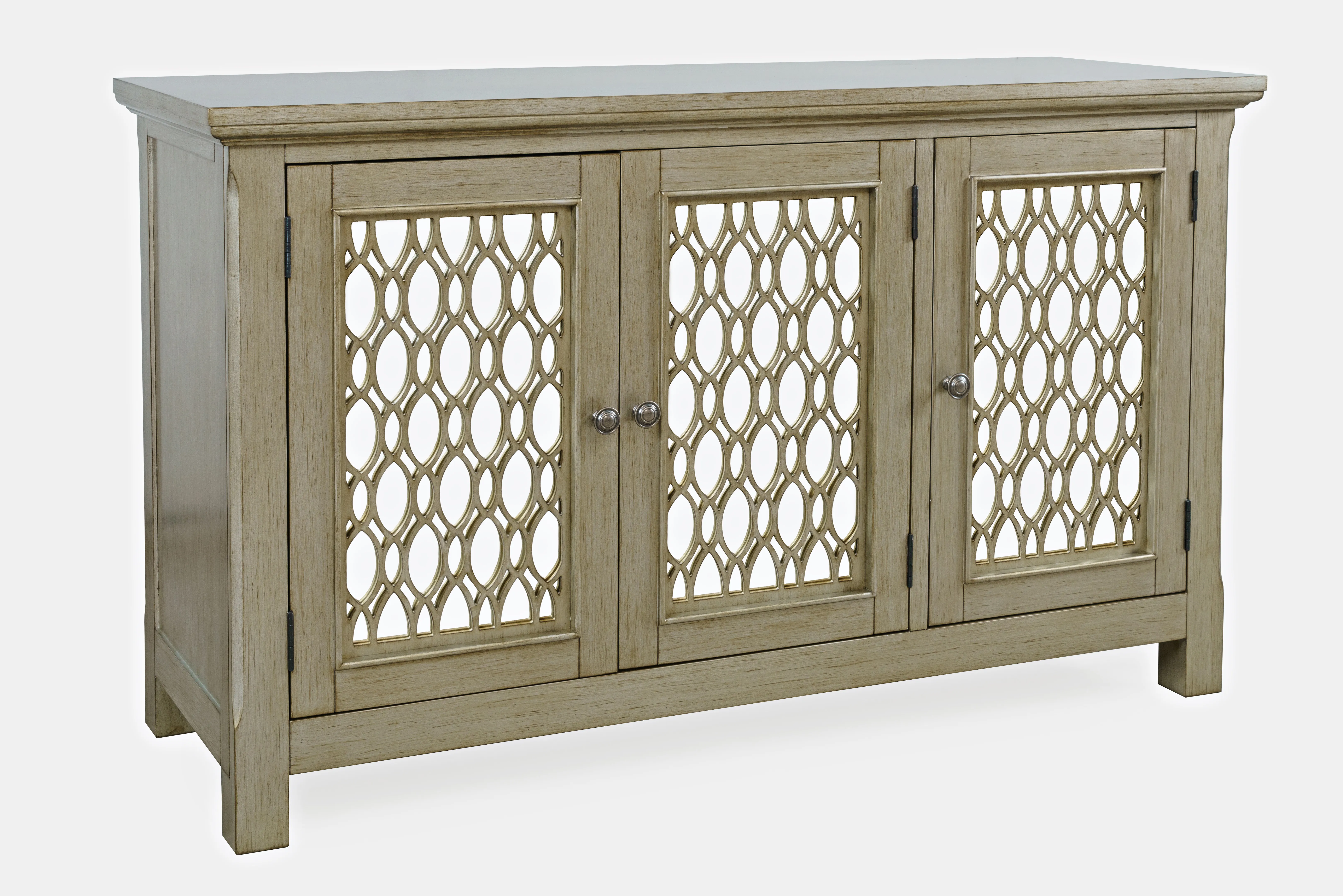 Experience the perfect blend of luxury and functionality with the Isabella mirrored three-door accent cabinet. Measuring 54 inches wide with inlaid fretwork and reflective doors that create a stunning effect that brightens up any room in your home with sophistication. Making a bold statement with a sleek design and solid metal hardware, the interior features adjustable shelving and cable management cutouts that allow you to customize the space to your exact storage needs. Easy to assemble and built with sturdy construction, the Isabella is a showstopper in any room. Make a statement and add a pop of luxury to your living space with the Isabella mirrored three-door accent cabinet.