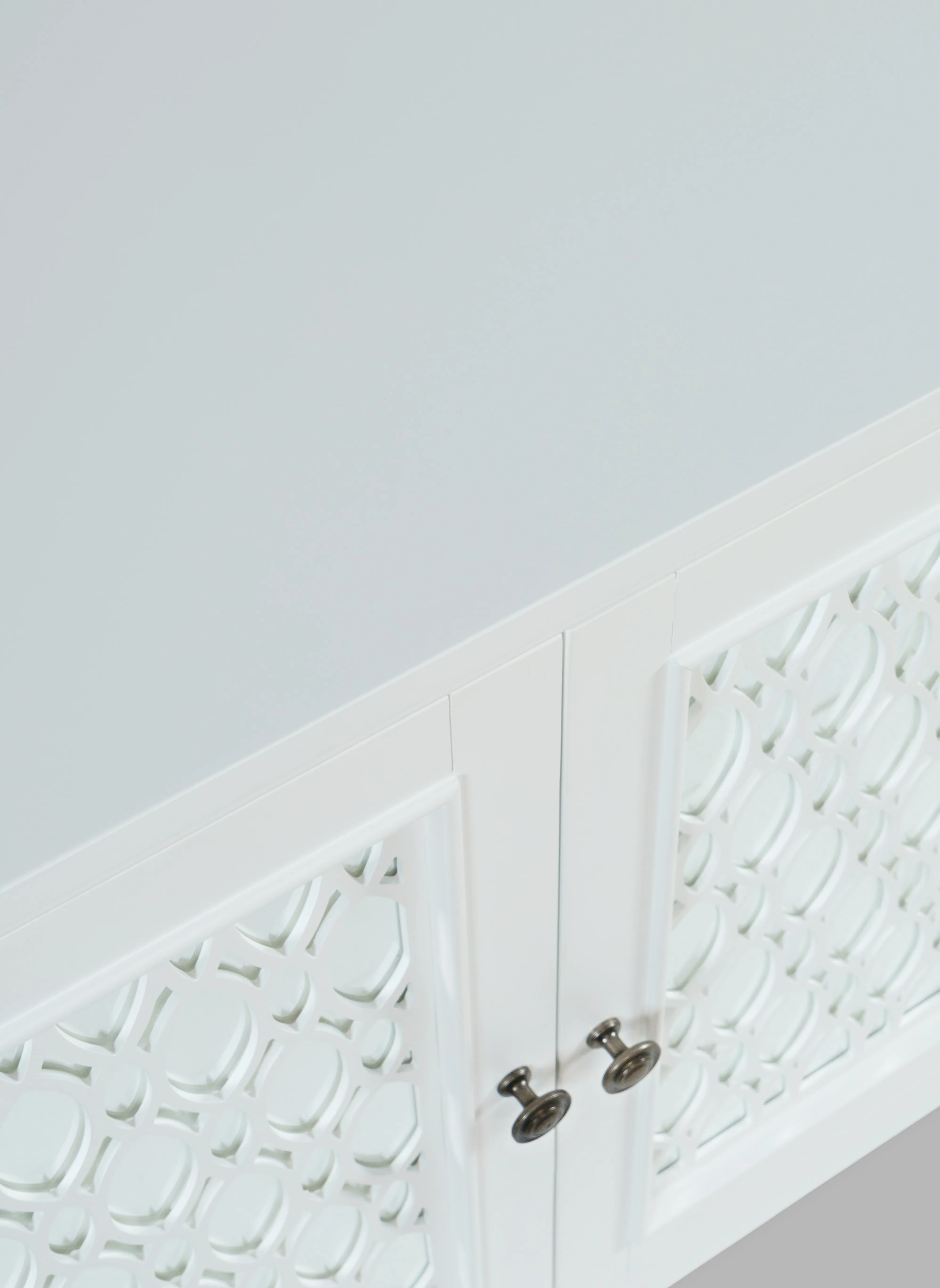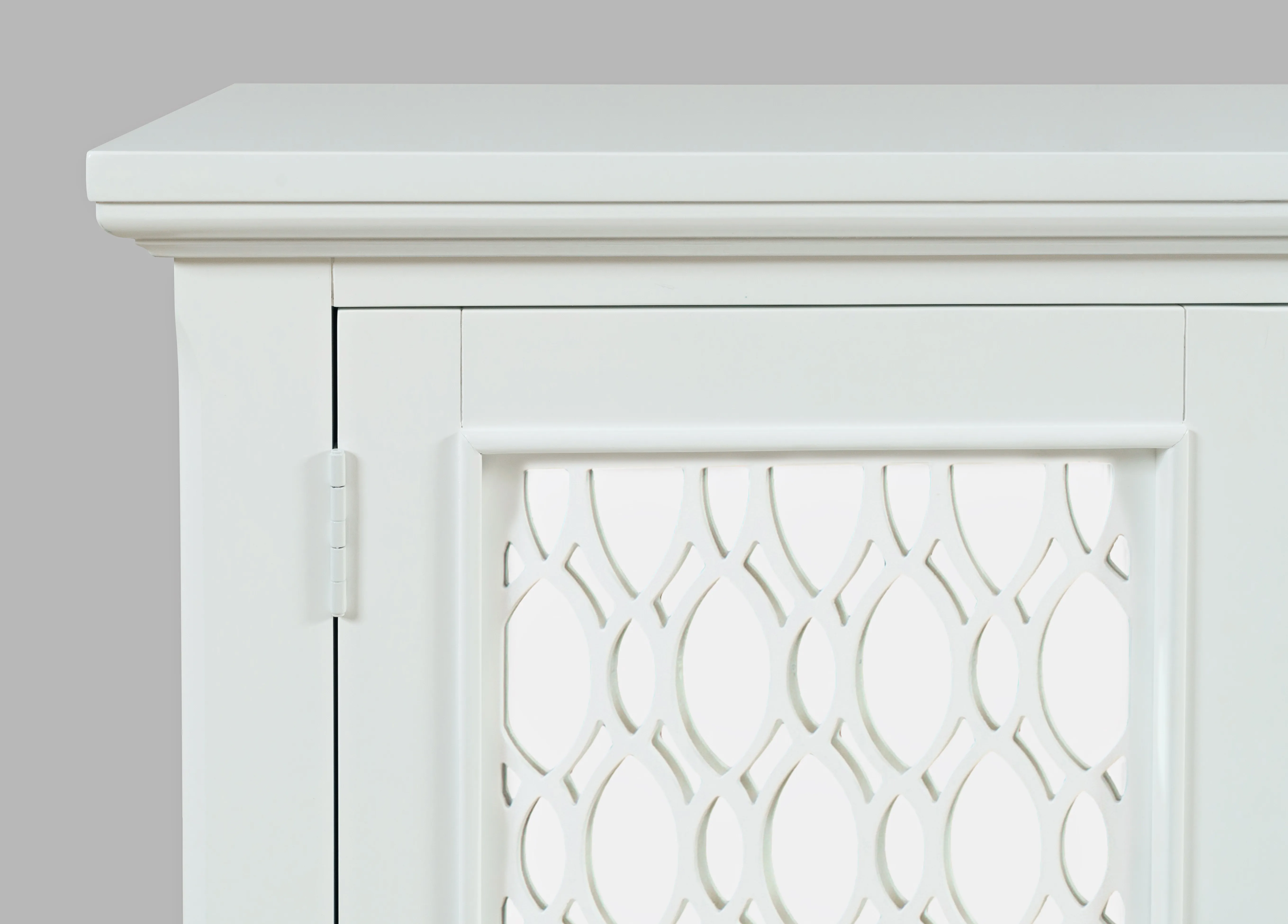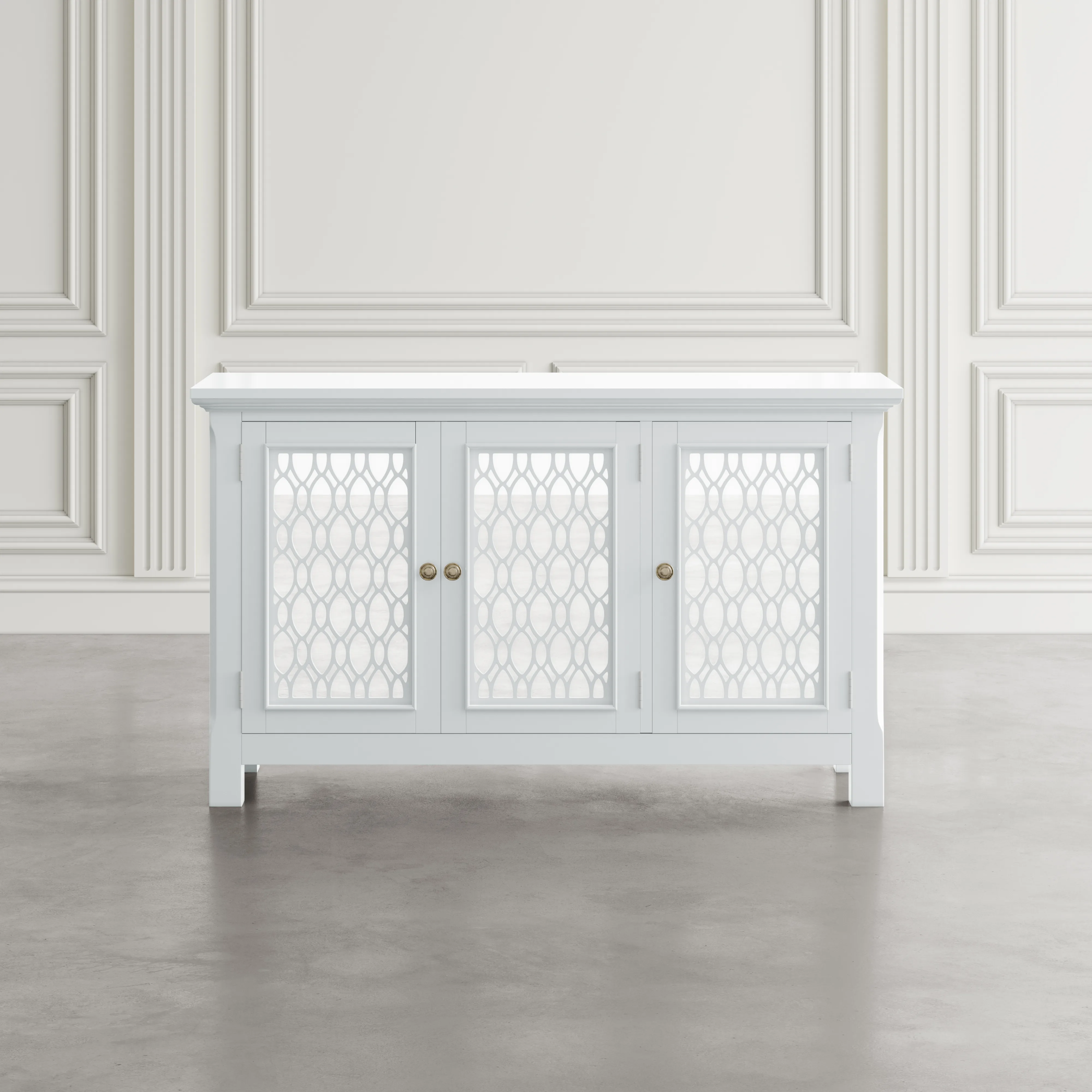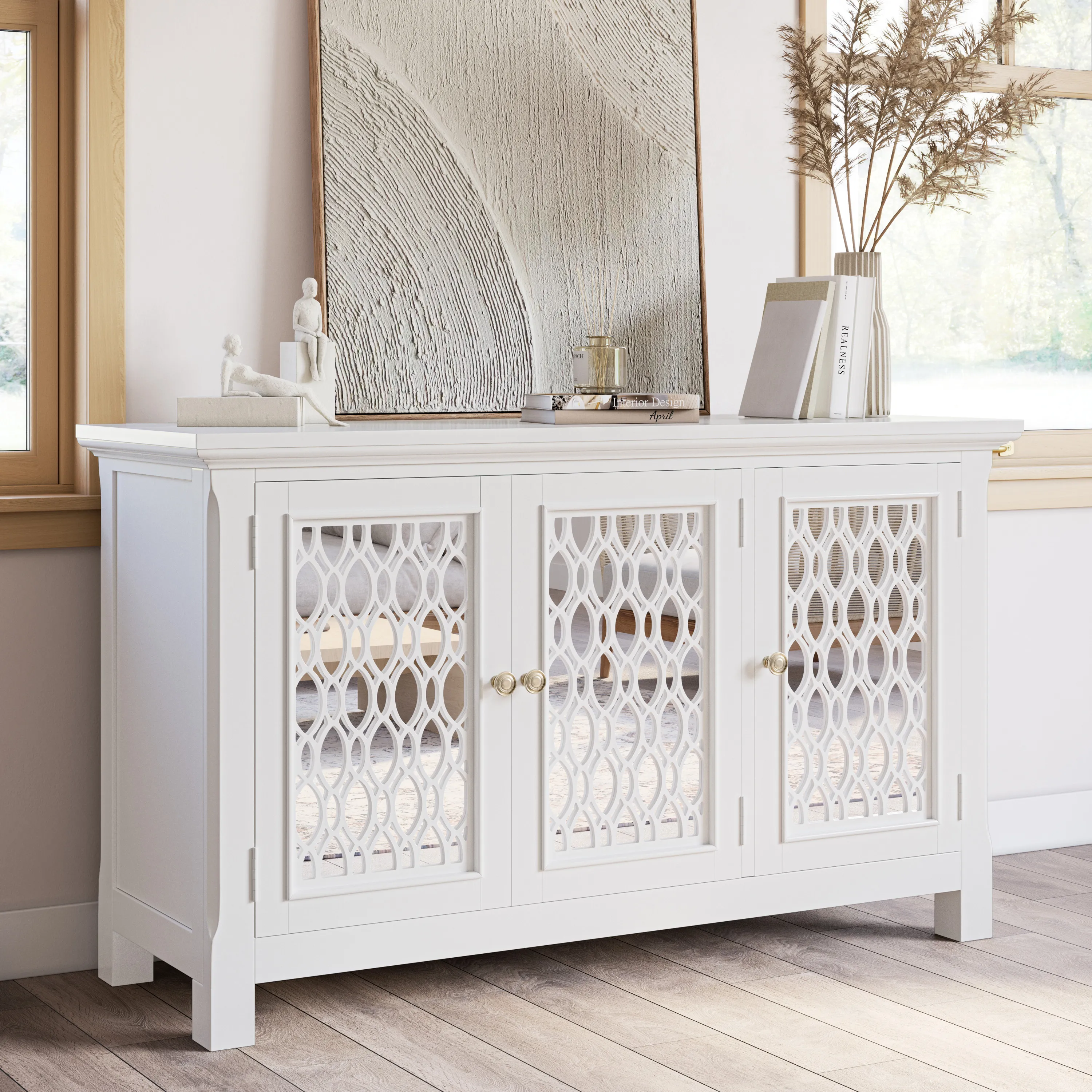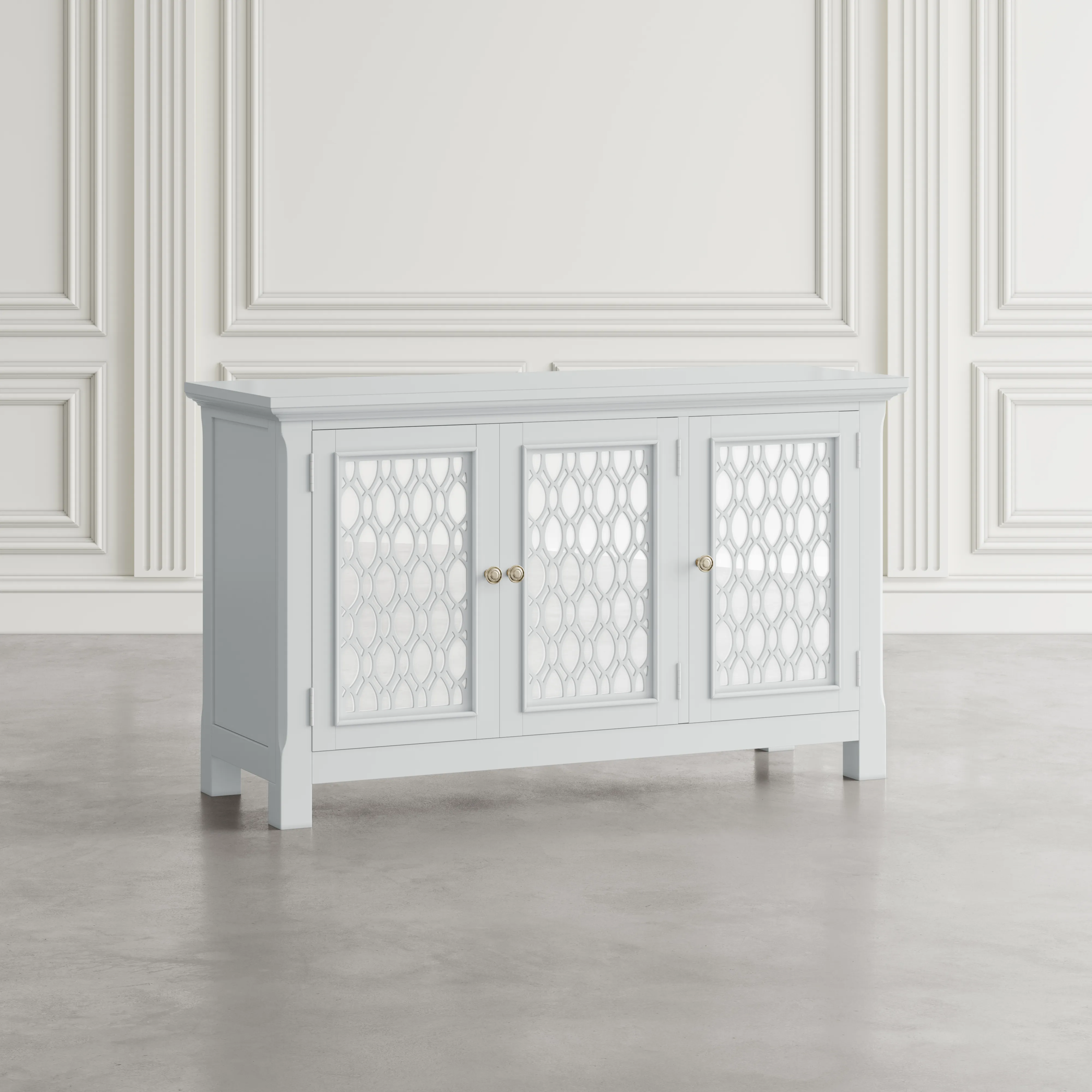 Experience the perfect blend of luxury and functionality with the Isabella mirrored three-door accent cabinet. Measuring 54 inches wide with inlaid fretwork and reflective doors that create a stunning effect that brightens up any room in your home with sophistication. Making a bold statement with a sleek design and solid metal hardware, the interior features adjustable shelving and cable management cutouts that allow you to customize the space to your exact storage needs. Easy to assemble and built with sturdy construction, the Isabella is a showstopper in any room. Make a statement and add a pop of luxury to your living space with the Isabella mirrored three-door accent cabinet.