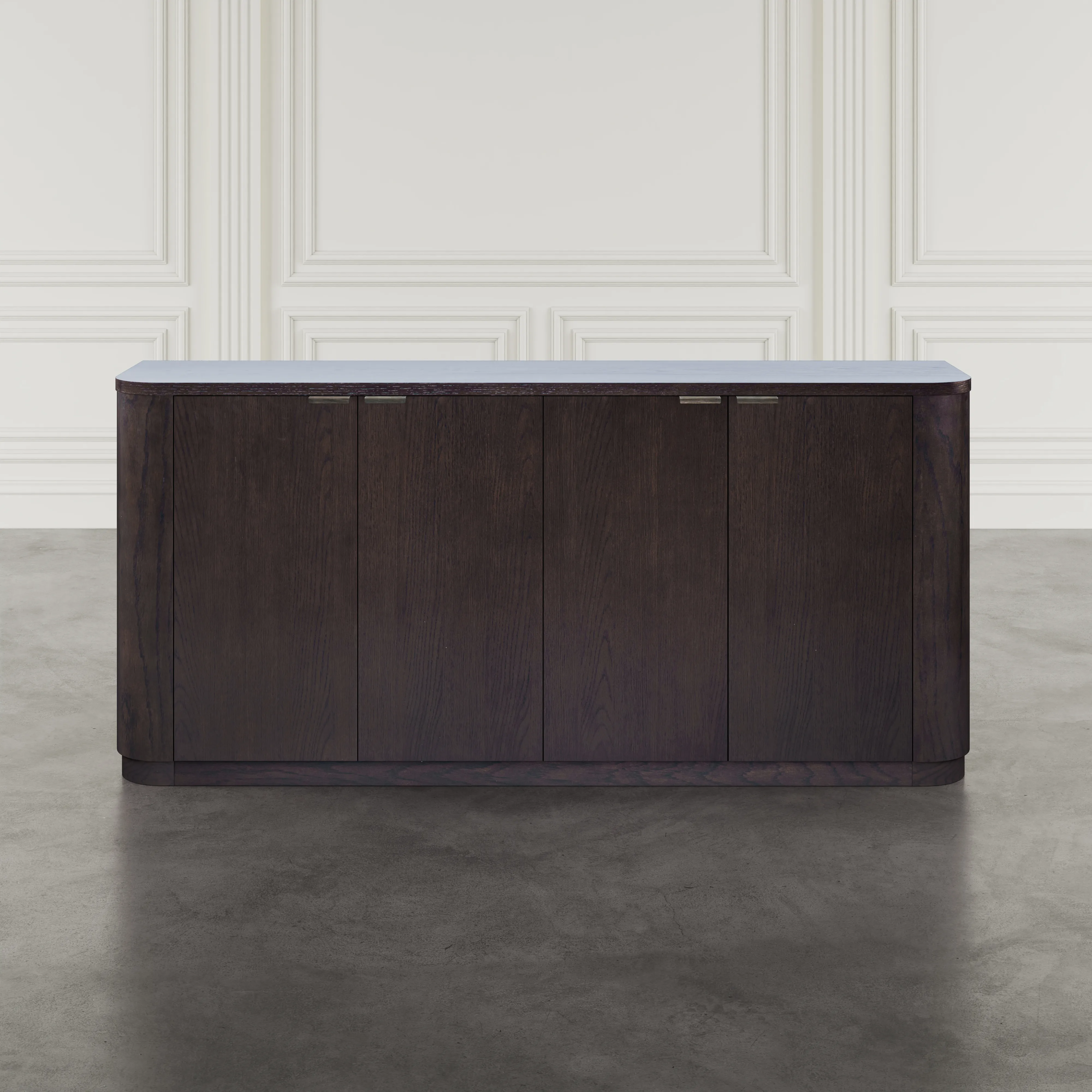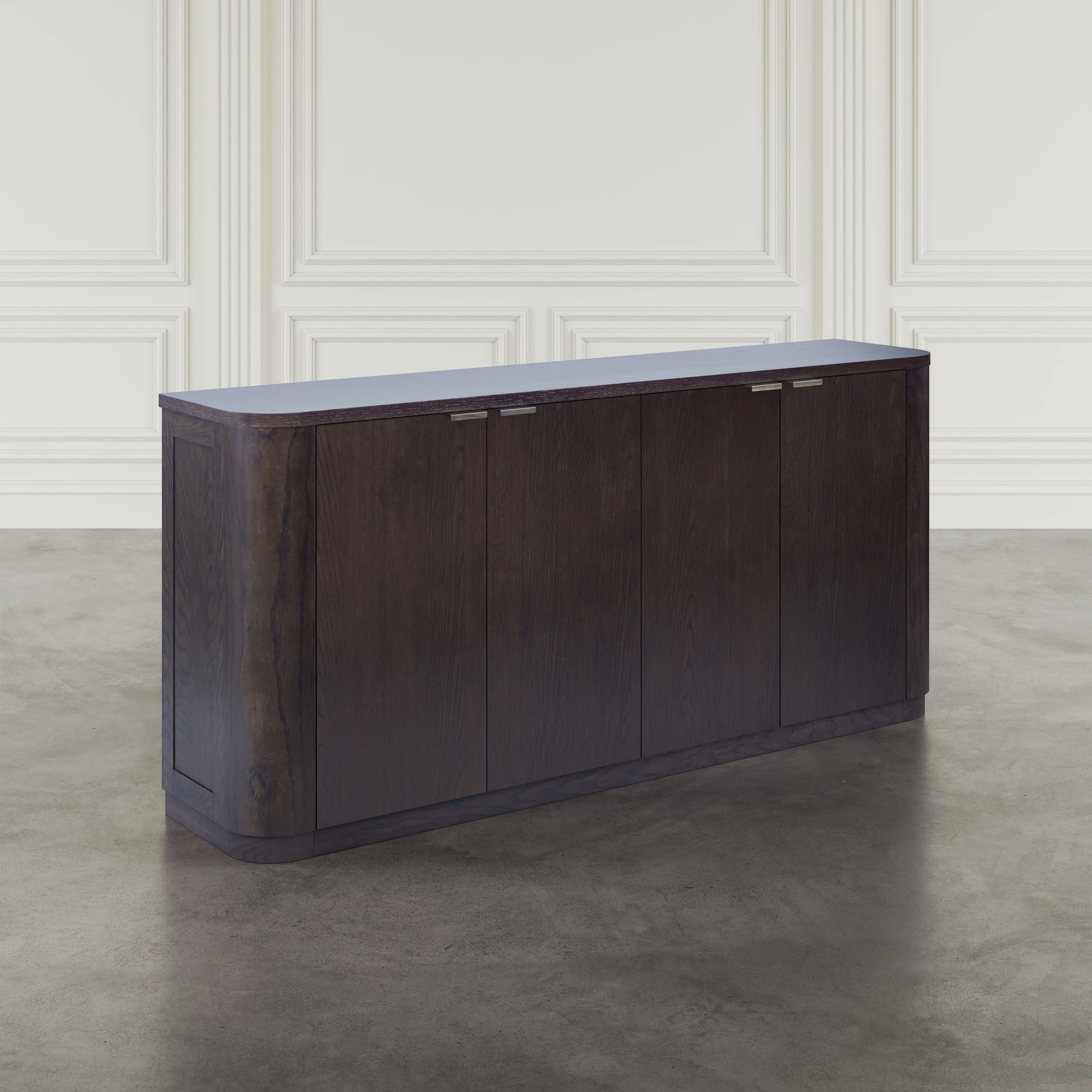 • -Durable rubberwood and veneer construction ensures long-lasting use -Four soft-close doors with two large adjustable interior shelves -Integrated cable management cutouts for electronics or media gear -Expansive 68 inch width for large-scale storage and display -Minimalist hardware and curved edges for a modern finish -Ideal for use as a dining buffet