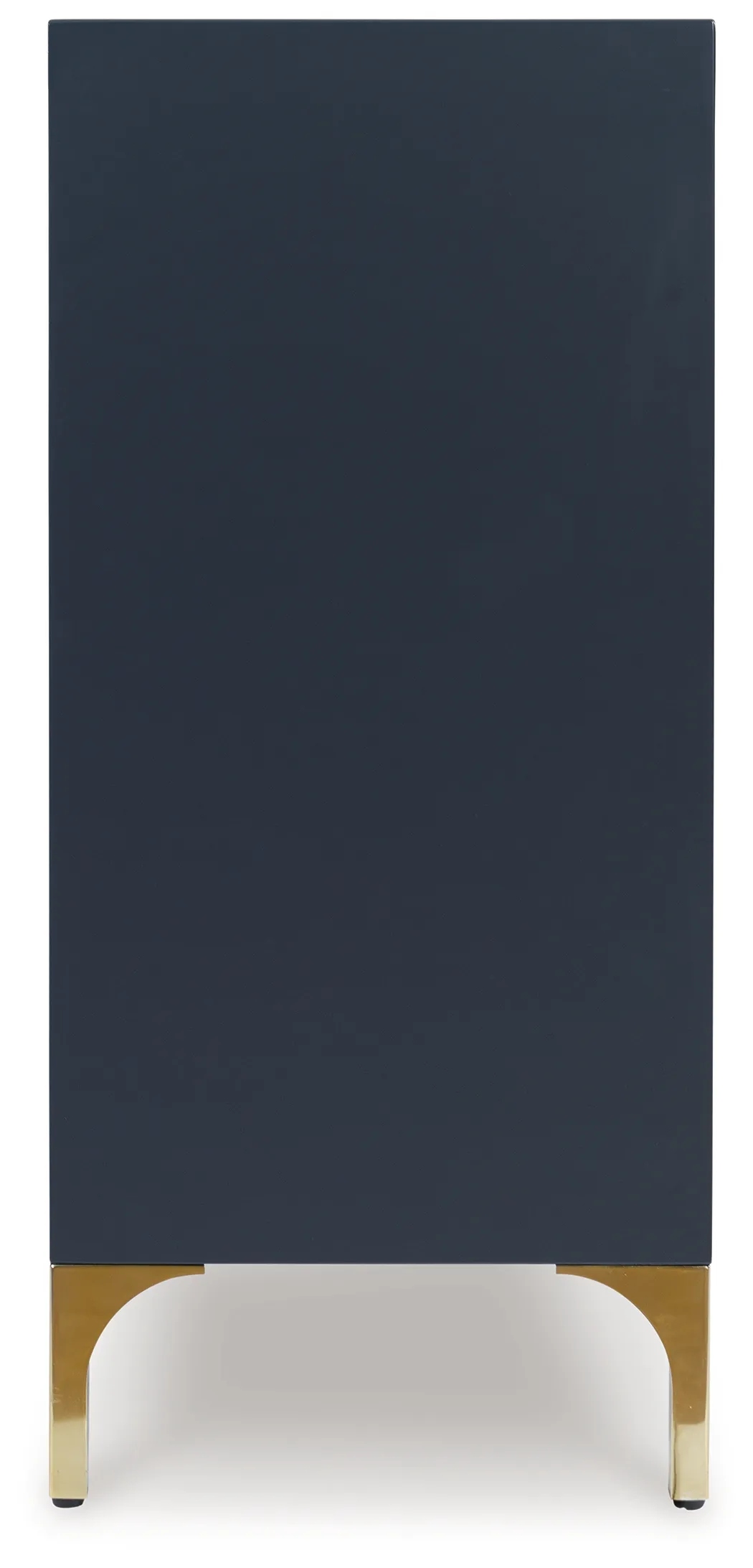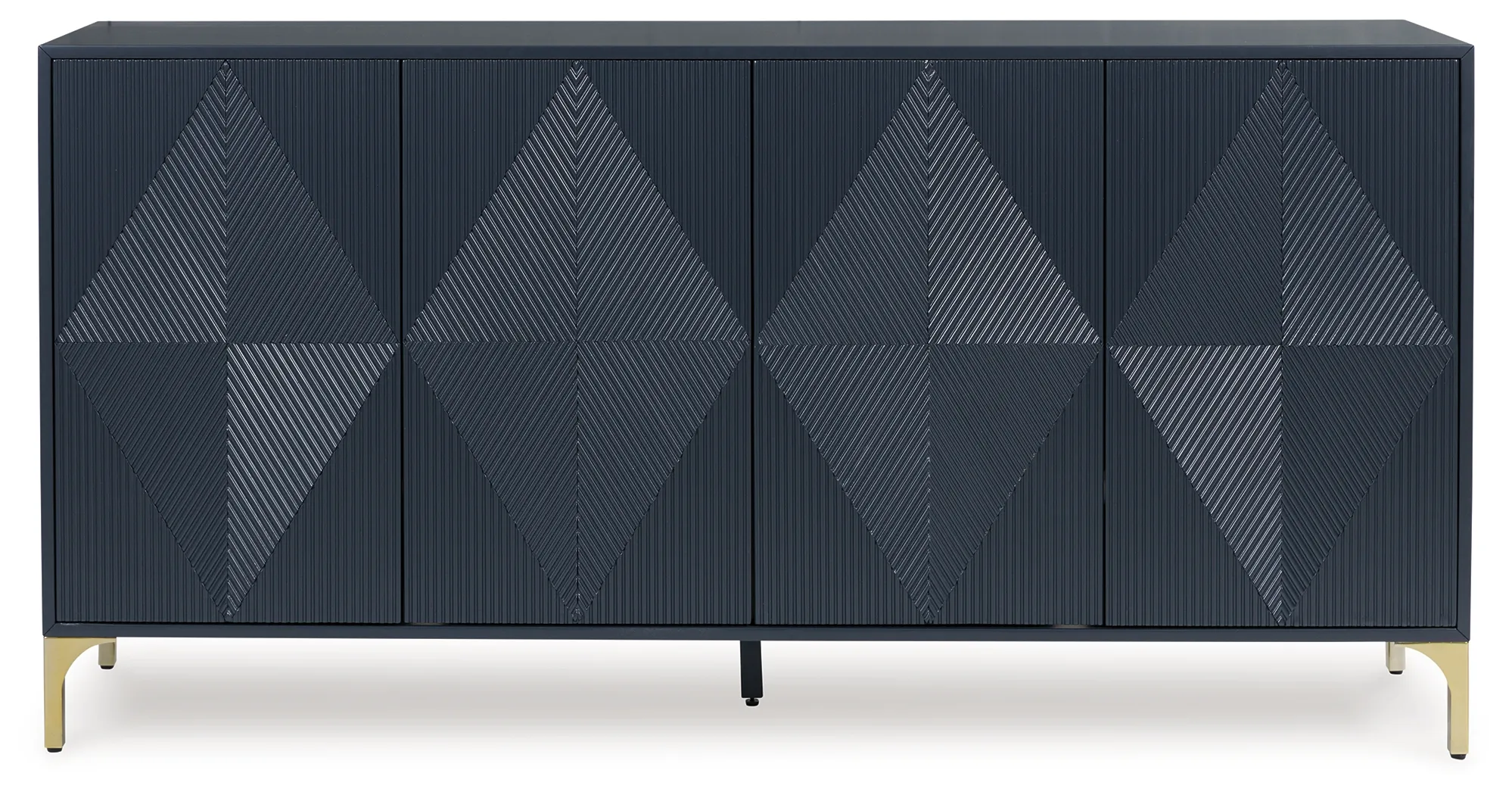 The Loirwick Accent Cabinet in Dark Blue is a modern geometric storage cabinet featuring push-latch doors, goldtone legs, and adjustable shelving. Perfect as a contemporary media cabinet, entryway cabinet, or dining room storage piece, it adds bold style and practical functionality to any space.