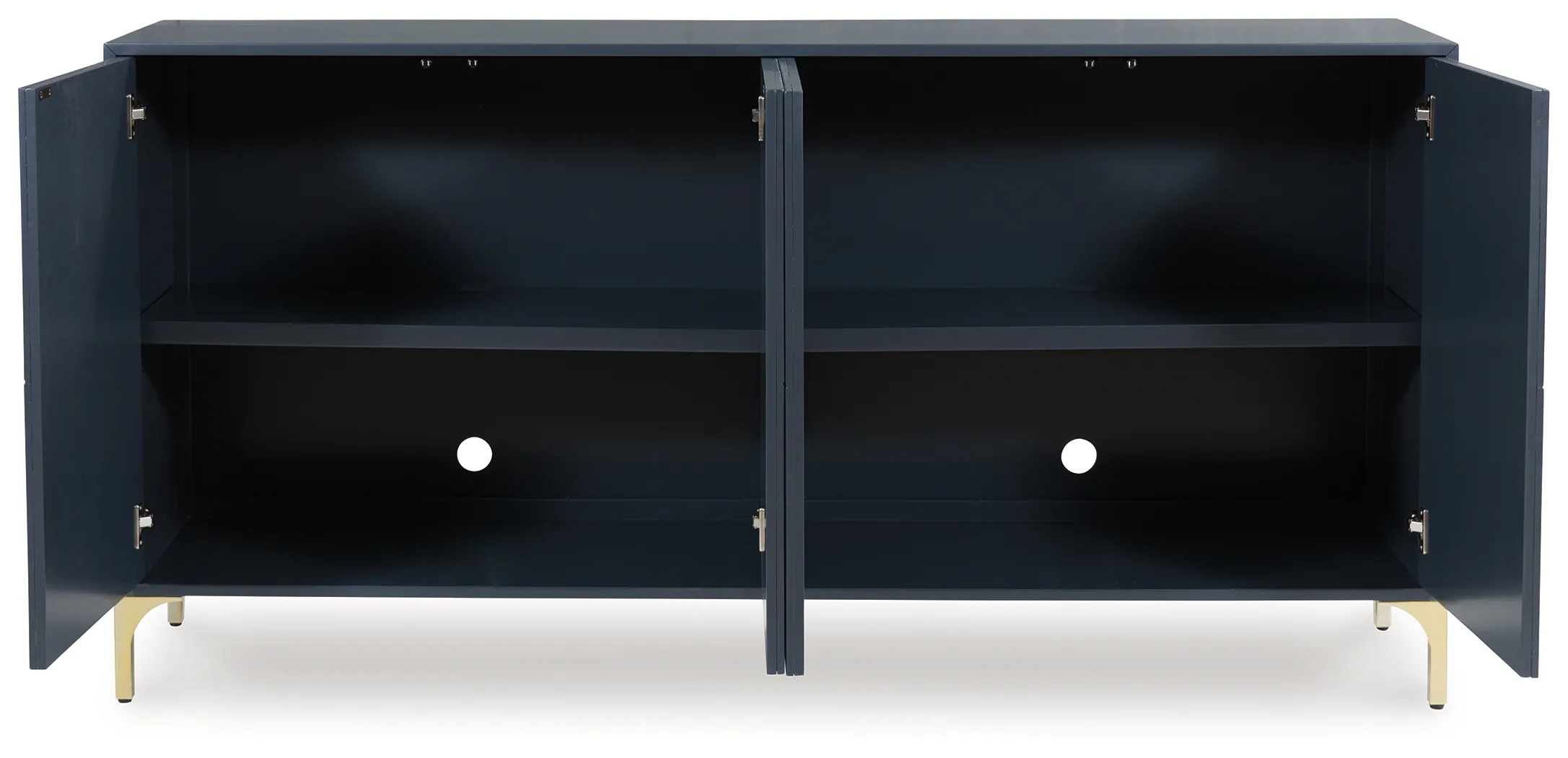 The Loirwick Accent Cabinet brings bold, modern sophistication to any room with its rich dark blue finish and striking geometric door fronts. Sleek goldtone metal legs add a touch of contemporary glam, while the clean-lined silhouette makes this cabinet a standout statement piece in entryways, dining rooms, living spaces, or offices. Designed for both style and practicality, it offers generous hidden storage with shelving and built-in cord management to keep your space polished and clutter-free.