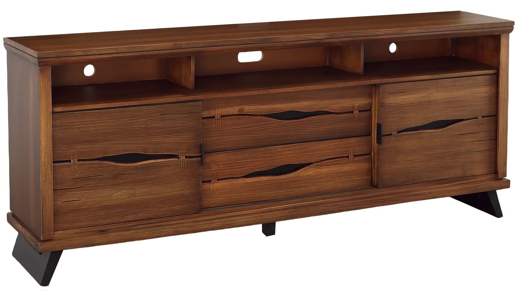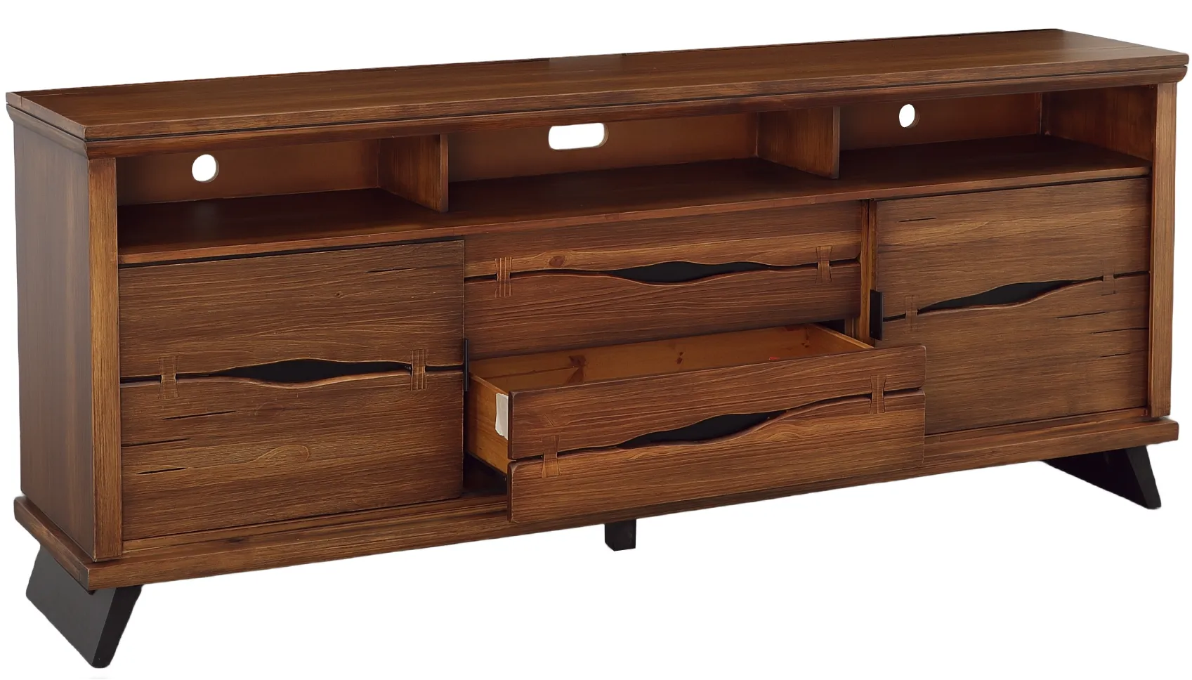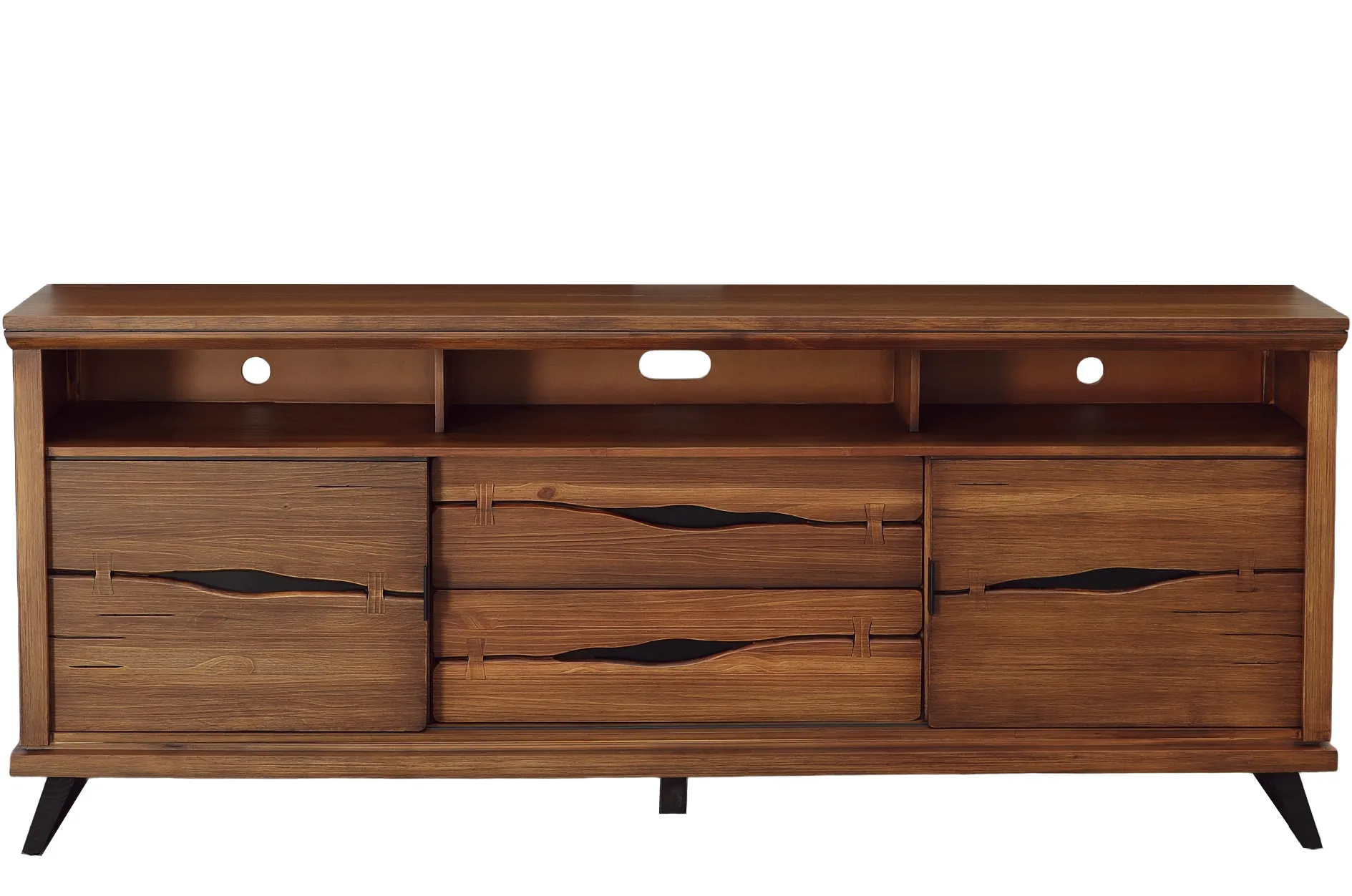 Marrying a modern silhouette with organic, live-edge materials, the Live Edge Solid Pine Entertainment Consoles will instantly elevate your living room ensemble. Carefully crafted from solid Brazilian Pine, these straightforward rectangular media consoles feature a natural Rustic Brown wood finish, accentuate the organic beauty in the wood grain. A live-edge finish on the drawer fronts and faux butterfly joinery accents lend a one-of-a-kind warmth to the streamlined silhouette, while the slanted, contemporary legs and modern amenities give the piece a fresh, forward-thinking appeal. A central open cubby at the top boasts a recessed shelf and rear cable access points, perfect for game consoles and media players, while the sliding door fronts on either side provide even more device storage. Two spacious storage drawers at the bottom make the perfect place for board games and other entertainment essentials.