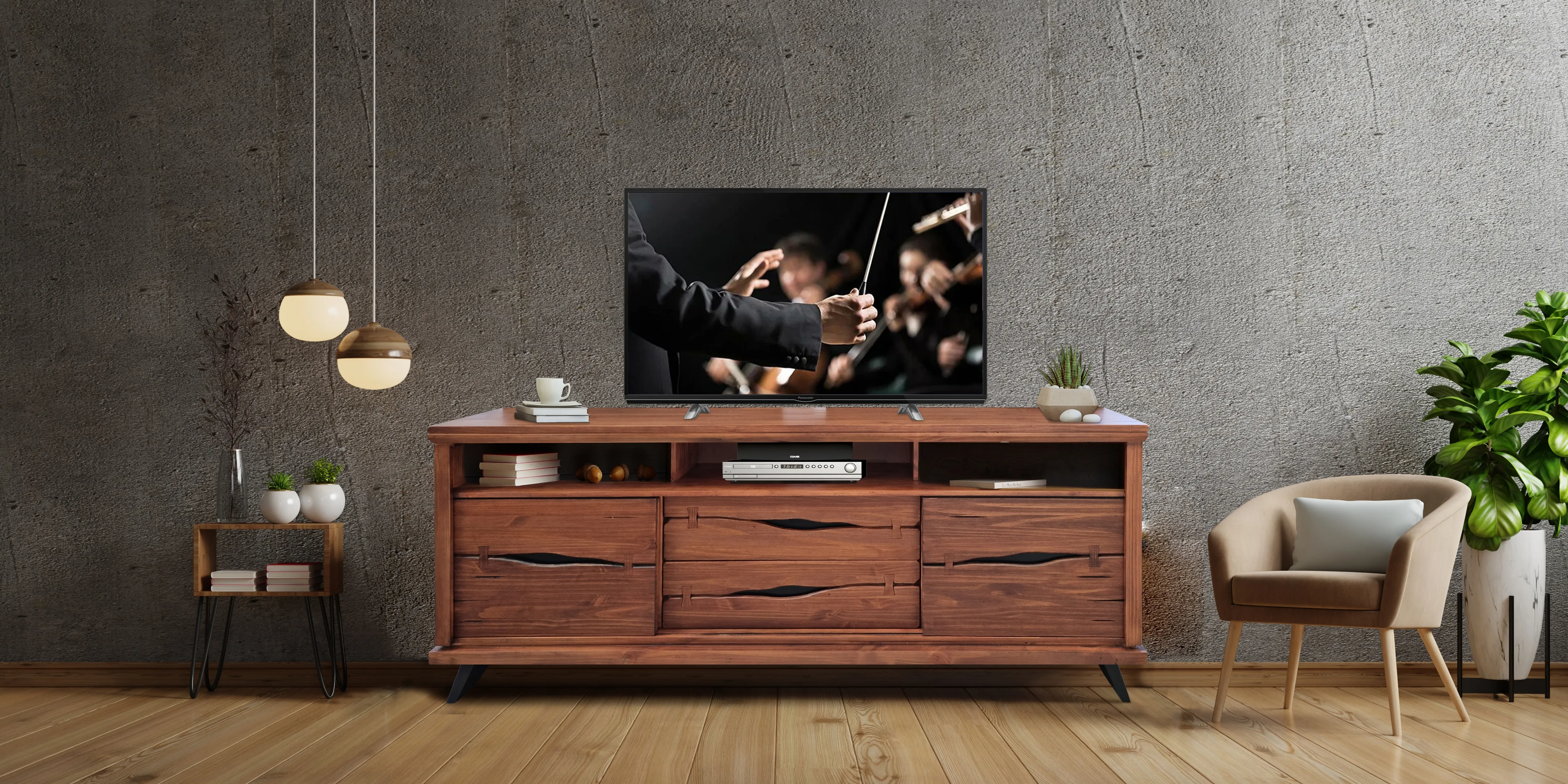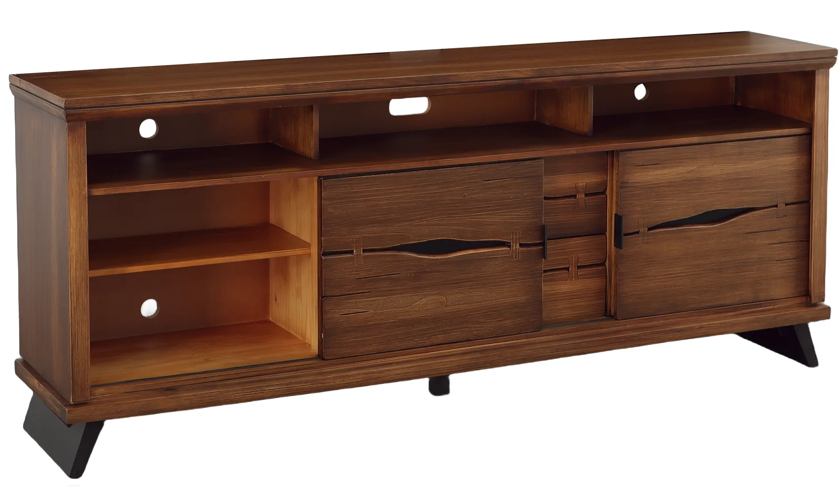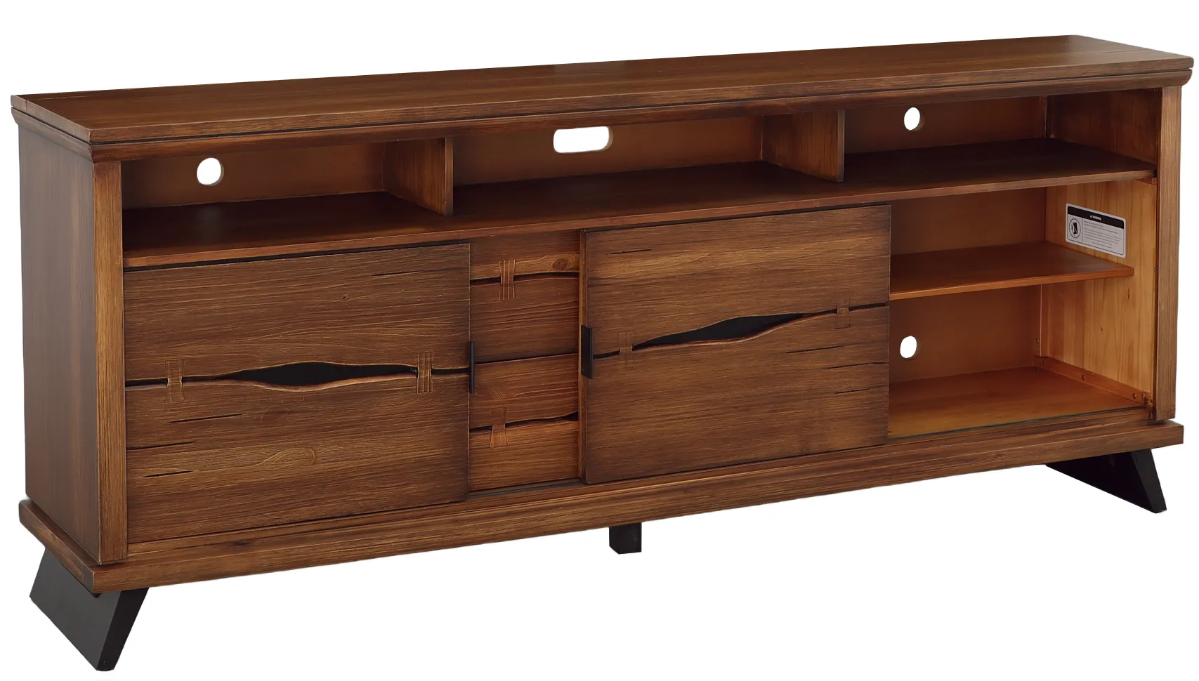 Marrying a modern silhouette with organic, live-edge materials, the Live Edge Solid Pine Entertainment Consoles will instantly elevate your living room ensemble. Carefully crafted from solid Brazilian Pine, these straightforward rectangular media consoles feature a natural Rustic Brown wood finish, accentuate the organic beauty in the wood grain. A live-edge finish on the drawer fronts and faux butterfly joinery accents lend a one-of-a-kind warmth to the streamlined silhouette, while the slanted, contemporary legs and modern amenities give the piece a fresh, forward-thinking appeal. A central open cubby at the top boasts a recessed shelf and rear cable access points, perfect for game consoles and media players, while the sliding door fronts on either side provide even more device storage. Two spacious storage drawers at the bottom make the perfect place for board games and other entertainment essentials.
