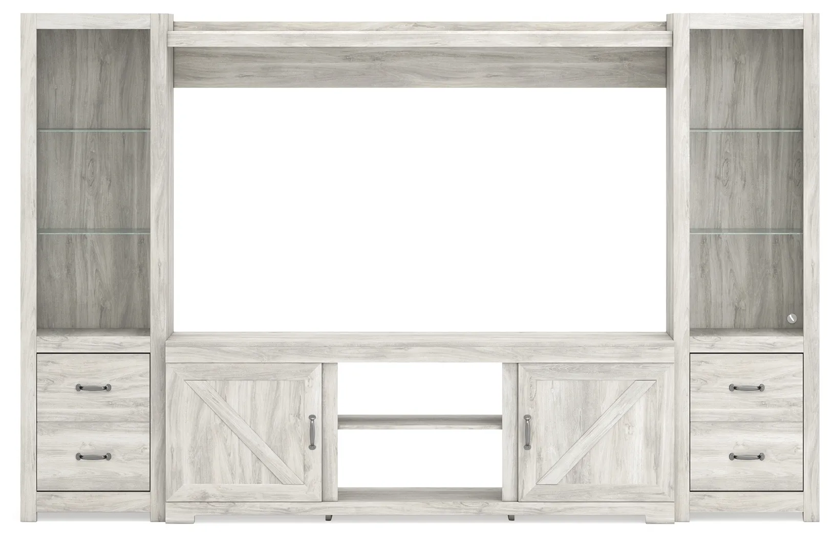 Express your farmhouse style with this entertainment center. Its wispy white finish over replicated oak wood grain is a delightful change from the ordinary. Clean-lined, classic styling with barn door inspiration provides a country chic aesthetic that’s a breath of fresh air. Combination of cabinet storage and open display space with LED lighting makes for just the right mix.