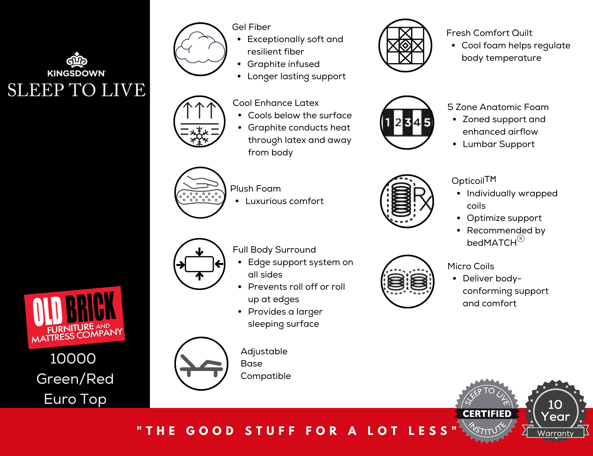 The Sleep to Live 10000 Eurotop Green Red Mattress by Kingsdown may be available at Old Brick Furniture & Mattress Co. in the Albany, Schenectady, Queensbury, Bennington, Pittsfield, Rutland, Clifton Park, Clifton Park, Amsterdam, Rutland, Rochester, Meredith, Laconia, Albany and Glenmont areas. Please contact us to check availability.
