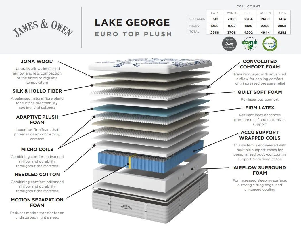The Lake George Euro Top Plush Mattress by James & Owen may be available at Old Brick Furniture & Mattress Co. in the Albany, Schenectady, Queensbury, Bennington, Pittsfield, Rutland, Clifton Park, Clifton Park, Amsterdam, Rutland, Rochester, Meredith, Laconia, Albany and Glenmont areas. Please contact us to check availability.