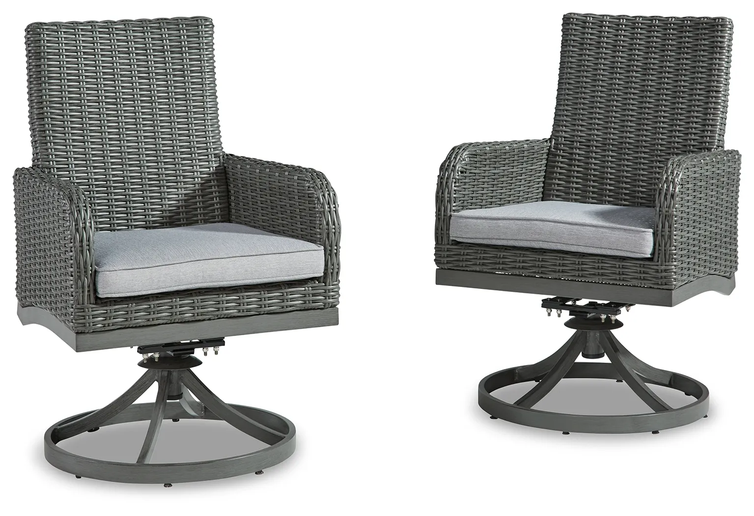 Elite Park Swivel Chair with Cushion (Set of 2): Add a distinguished touch of gray to your outdoor living space with this swivel chair. It's made with resin wicker over an aluminum frame with a wood-look finish for a relaxed feel that provides seasons of enjoyment. Rest assured, the thick seat cushion is wrapped in Nuvella® high-performance fabric that’s fade-resistant, stain-resistant and a breeze to clean.