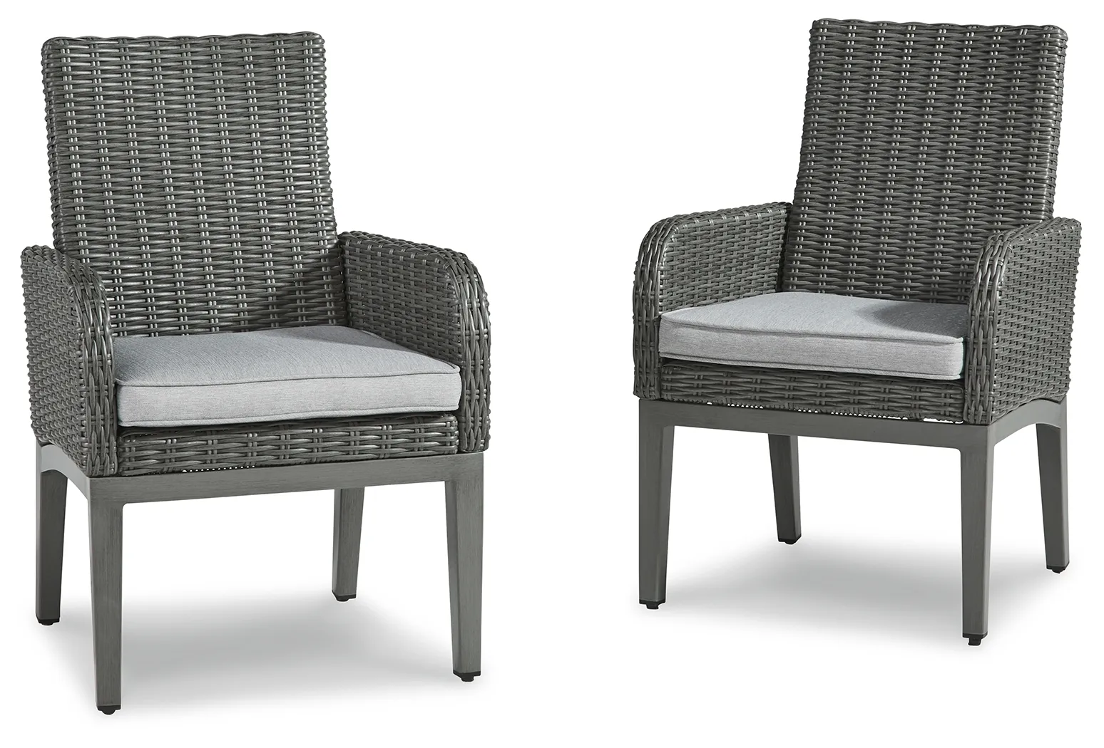 Elite Park Arm Chair with Cushion (Set of 2): Add a distinguished touch of gray to your outdoor living space with this arm chair. It's made with resin wicker over an aluminum frame with a wood-look finish for a relaxed feel that provides seasons of enjoyment. Rest assured, the thick seat cushion is wrapped in Nuvella® high-performance fabric that’s fade-resistant, stain-resistant and a breeze to clean.