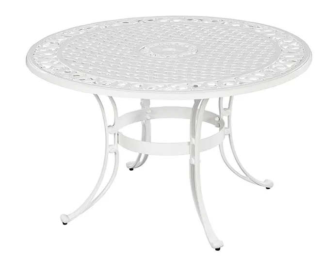 This Sanibel 5-piece dining set includes a round table and four arm chairs with cushions, all made of cast aluminum with a powder-coated finish and a clear coat that offers protection from the elements. The table top and seat design allows water to quickly drain to prevent pooling or staining.