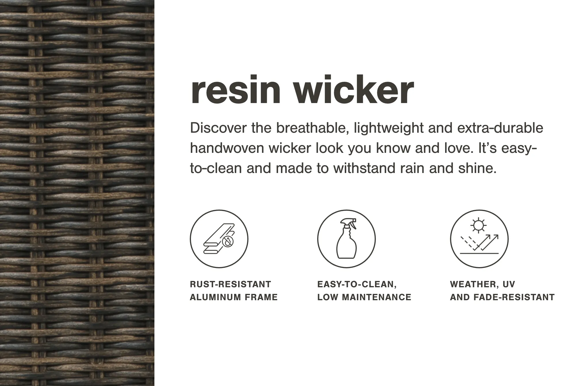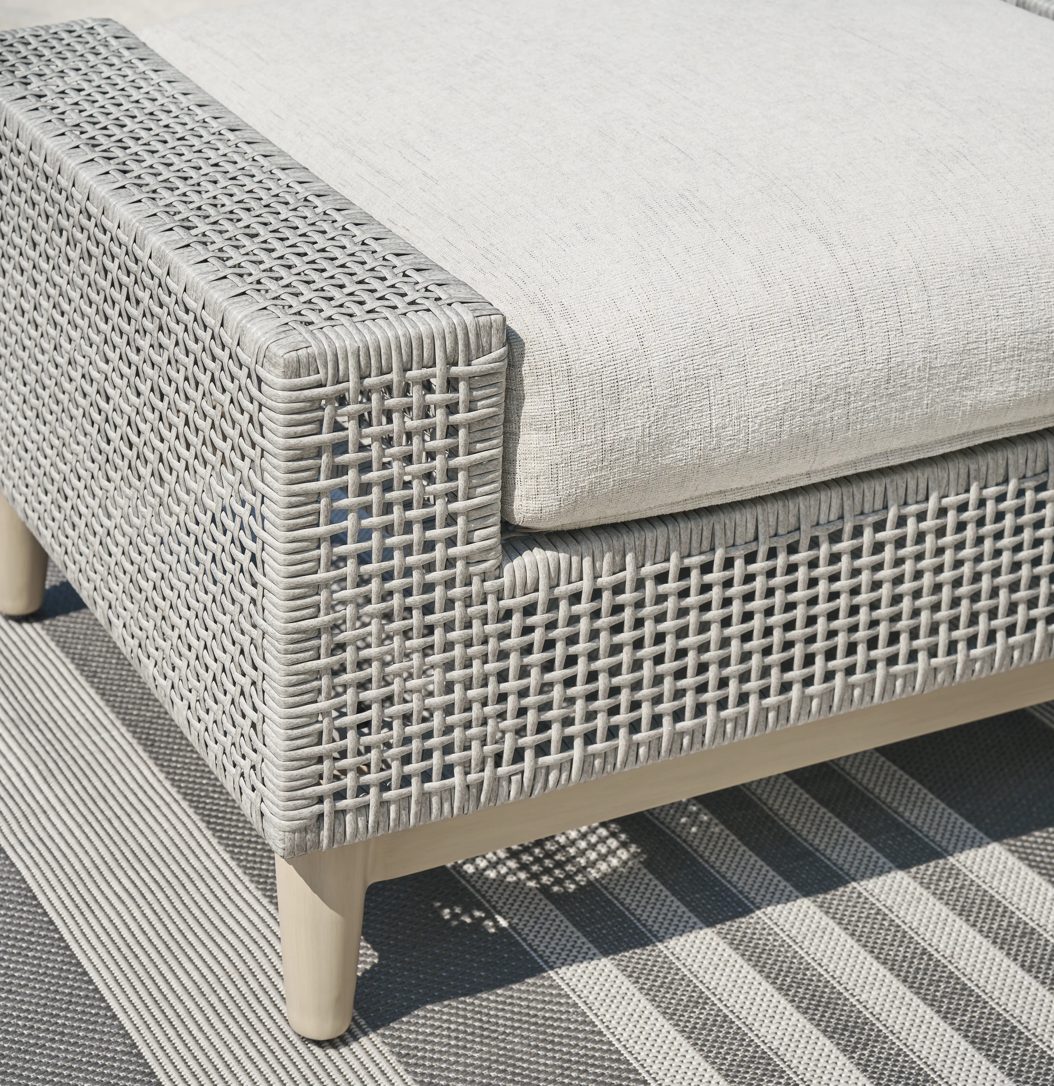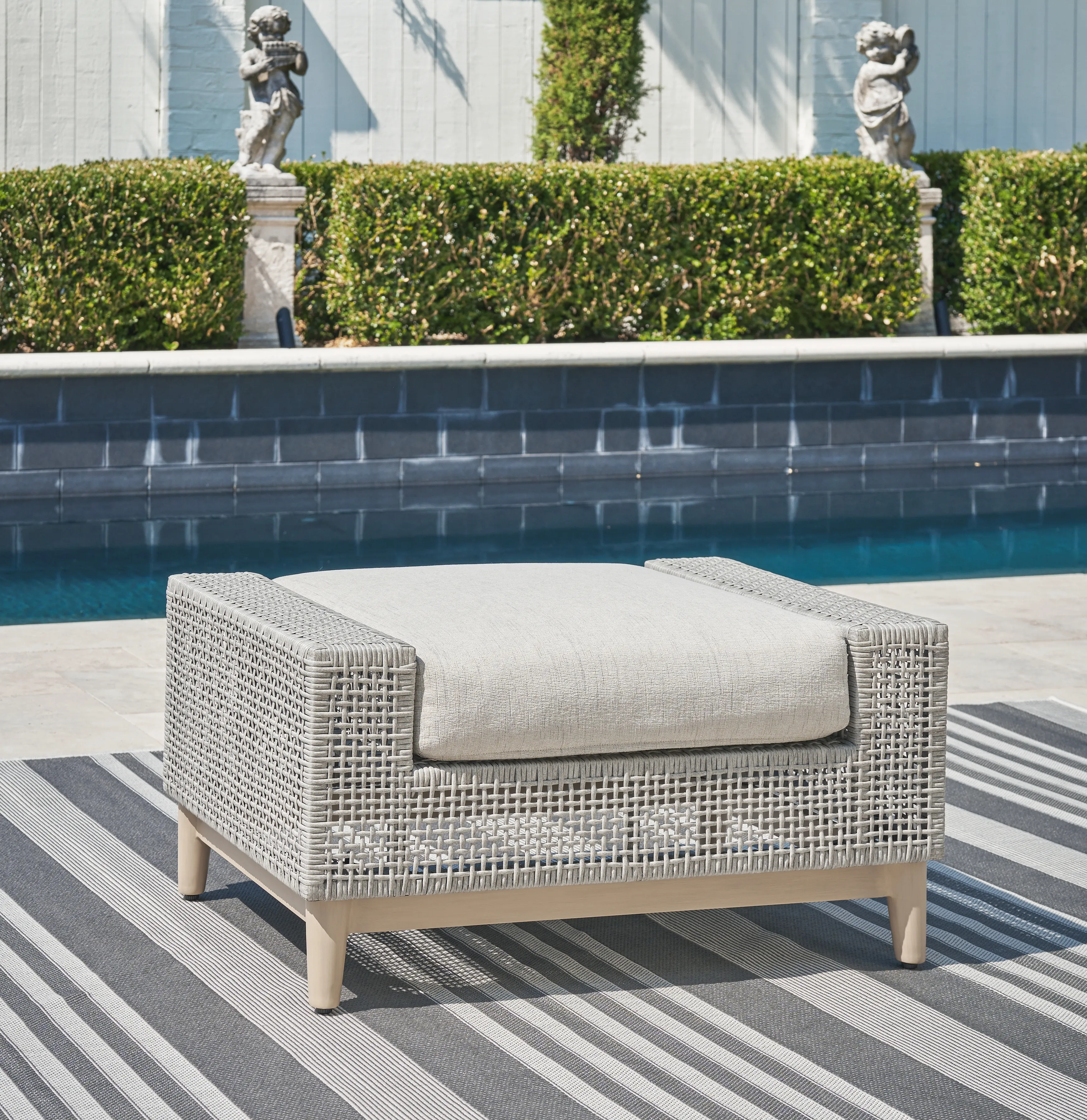 This ottoman invites your casual contemporary style outdoors. With its resin wicker in a chic neutral hue, it expertly marries refined design with durability. Breezy summer mornings and cold winter nights are made all the more comfortable with high-performance Nuvella+â„¢ fabric covering the cushion.