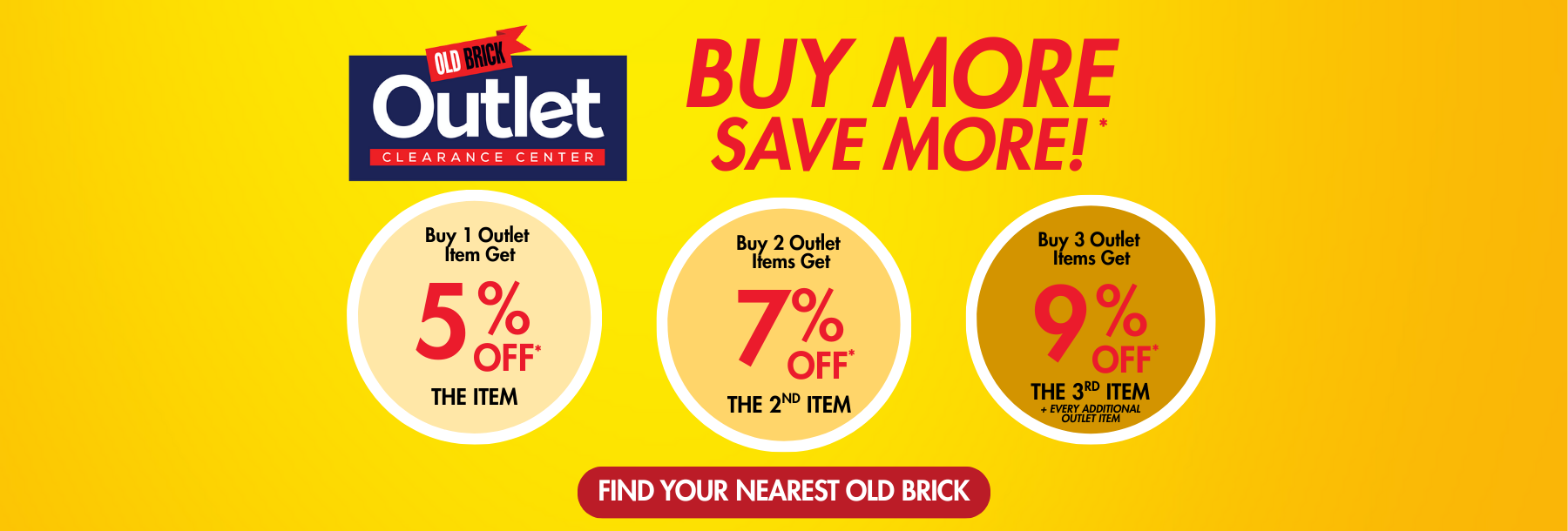 **Highest discount applies to lowest priced item when multiple items are purchased. Prior purchases excluded. No minimum purchase required. Only applicable to outlet/clearance items. No additional discounts applicable. ALL SALES FINAL. Merchandise must be picked up or delivered 10 days after purchase.